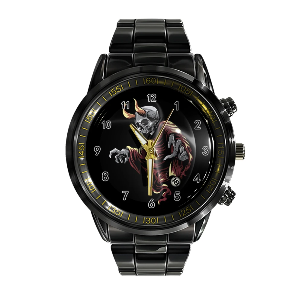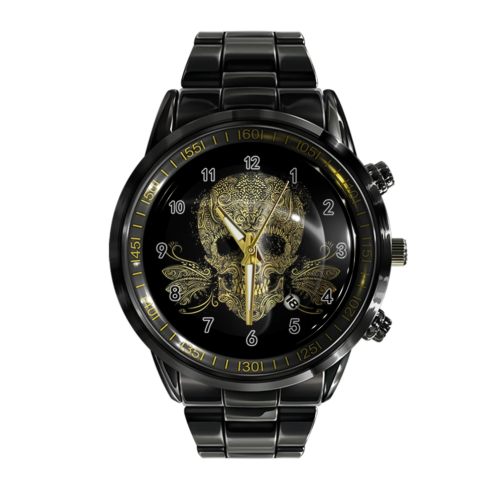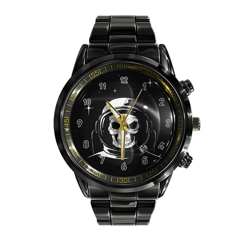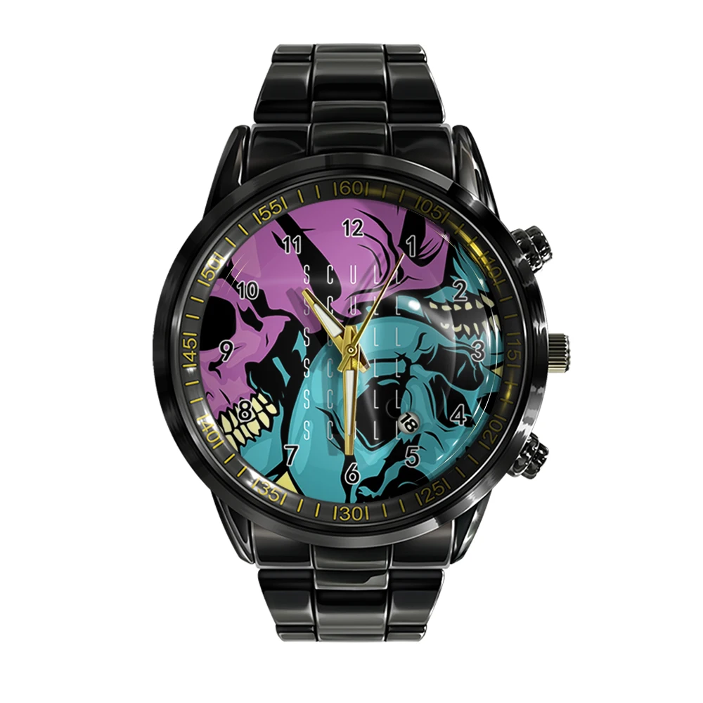 « Skullwatch » – Montre bracelet en acier pour homme, calendrier ual, couleur noir et blanc, tête de mort, sport, affaires.