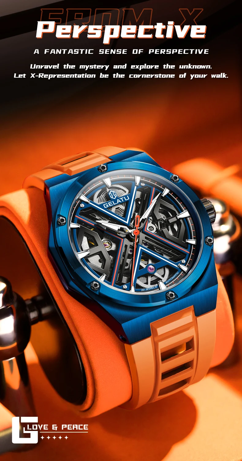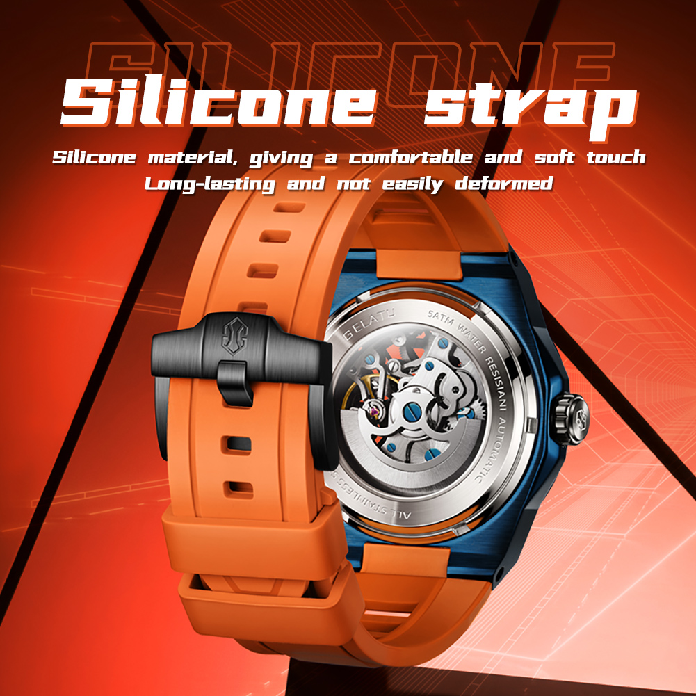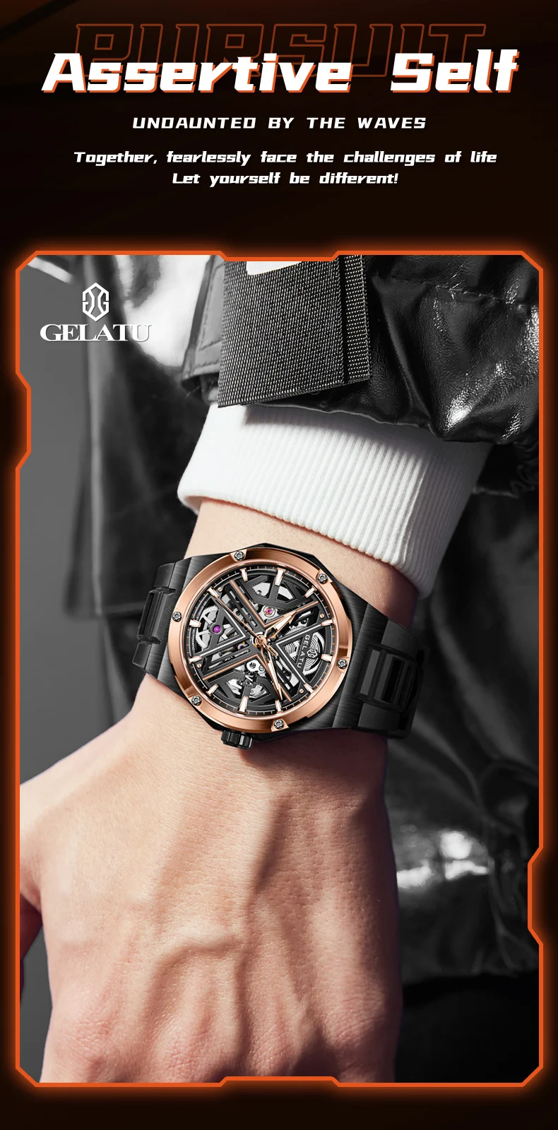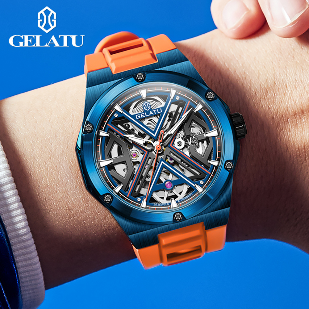 GELATU Nouvelle Montre Mécanique Automatique pour Hommes Bracelet en Silicone Saphir Miroir Squelette Creux Marque de Luxe Montre-Bracelet pour Hommes
