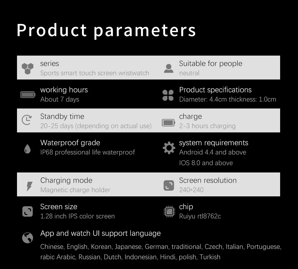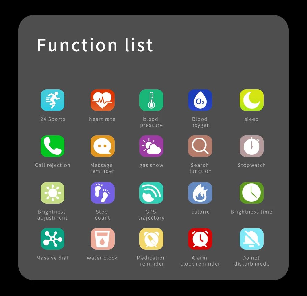 * Plus Fonction:Alarme, chronomètre, la météo, la musique contrôle, camera control, régler la luminosité, trouver téléphone/montre, ascenseur le poignet écran égayer, mise à niveau du firmware (OTA), ne pas déranger mode