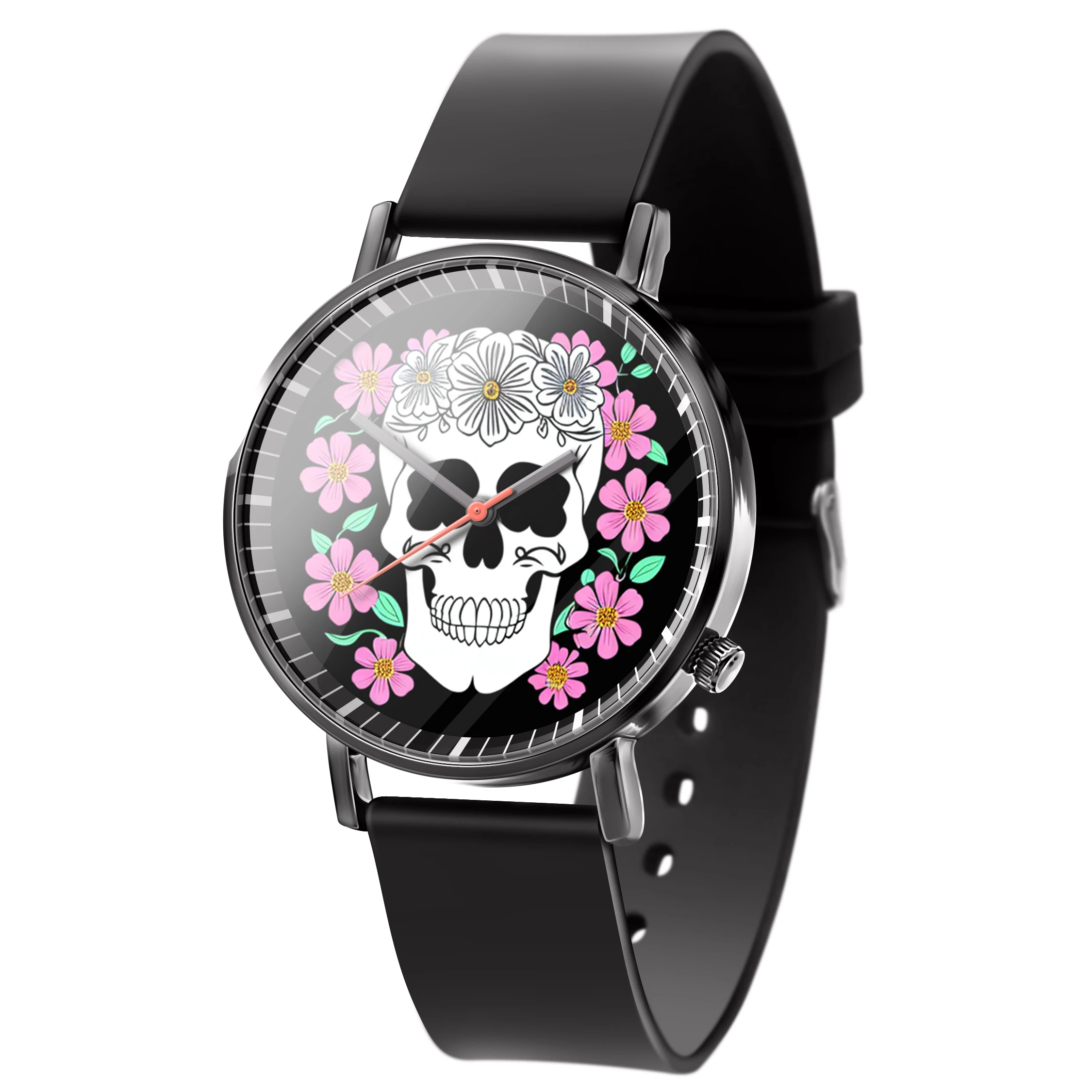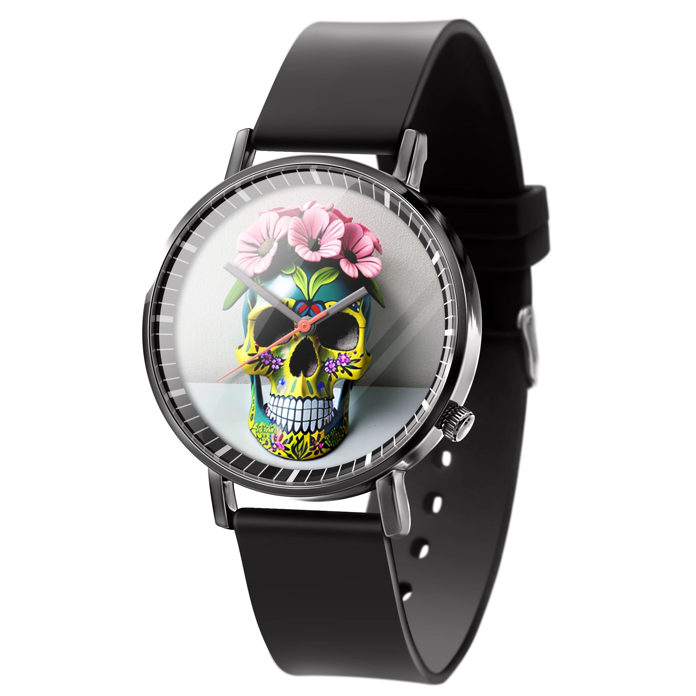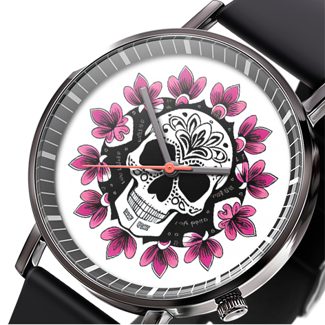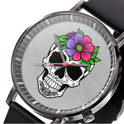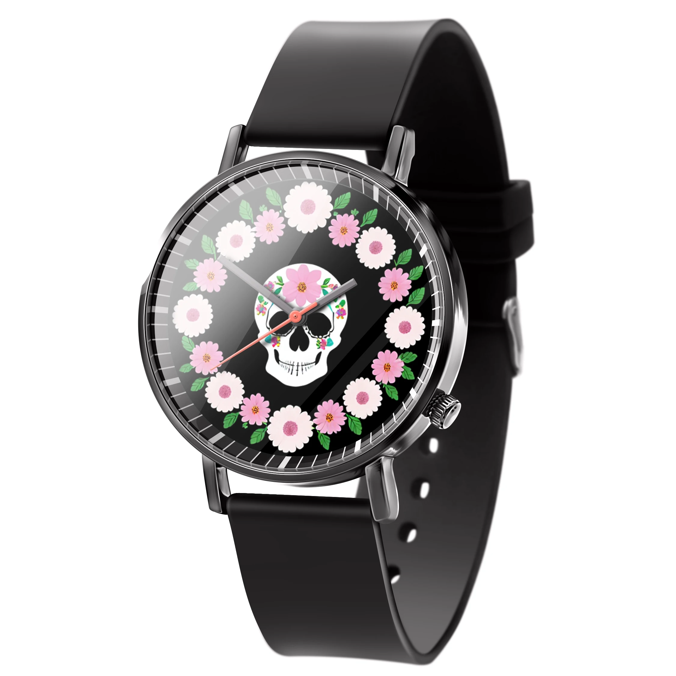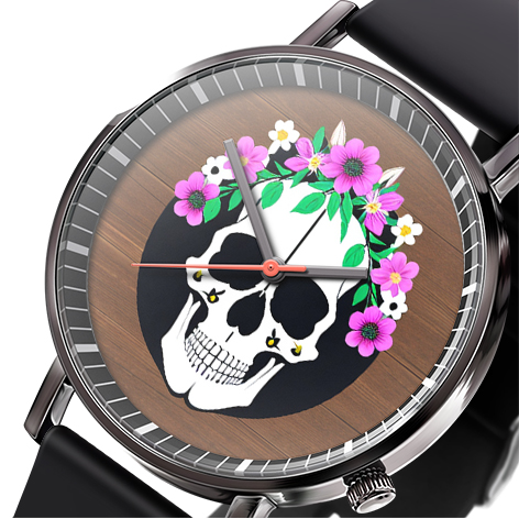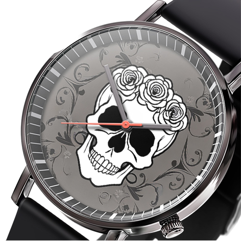 « Skullwatch »: Montre-bracelet à quartz tendance pour homme, crâne, fleurs noires et blanches. Mode, affaires, sport.