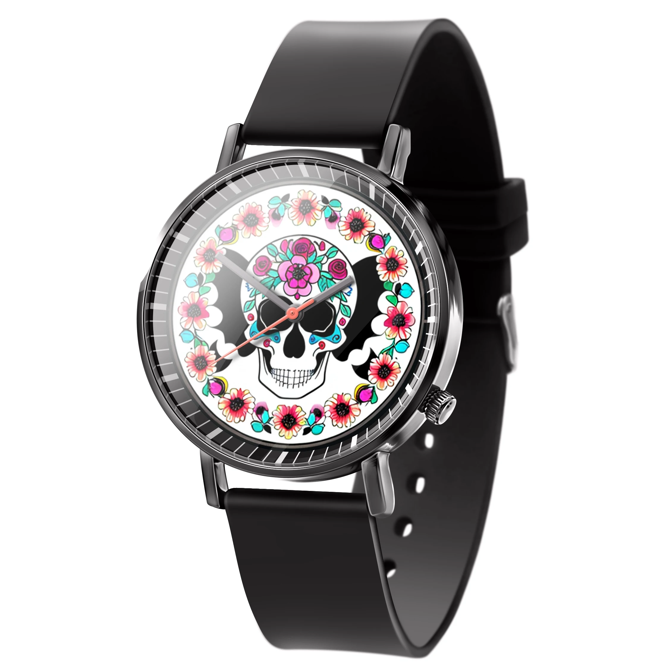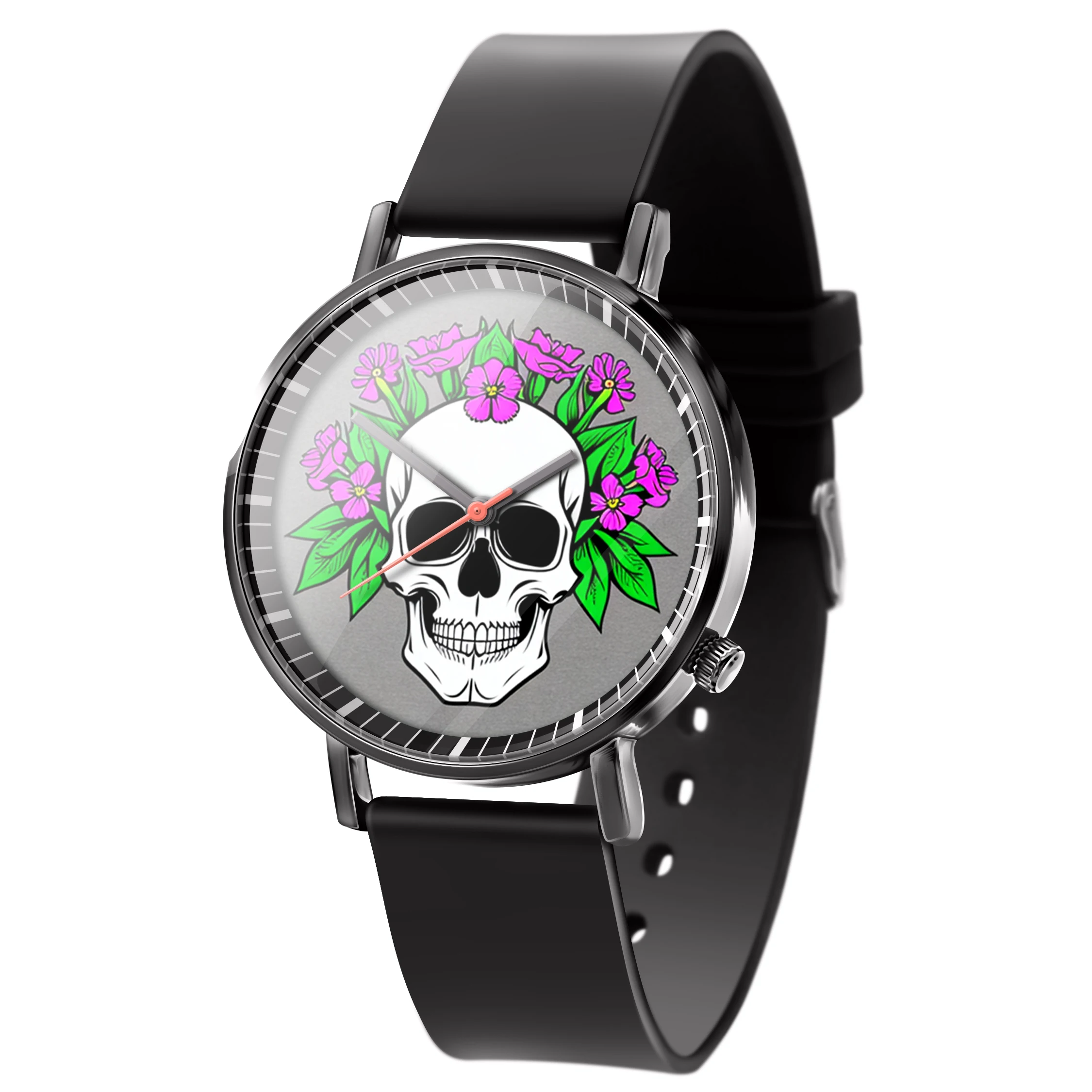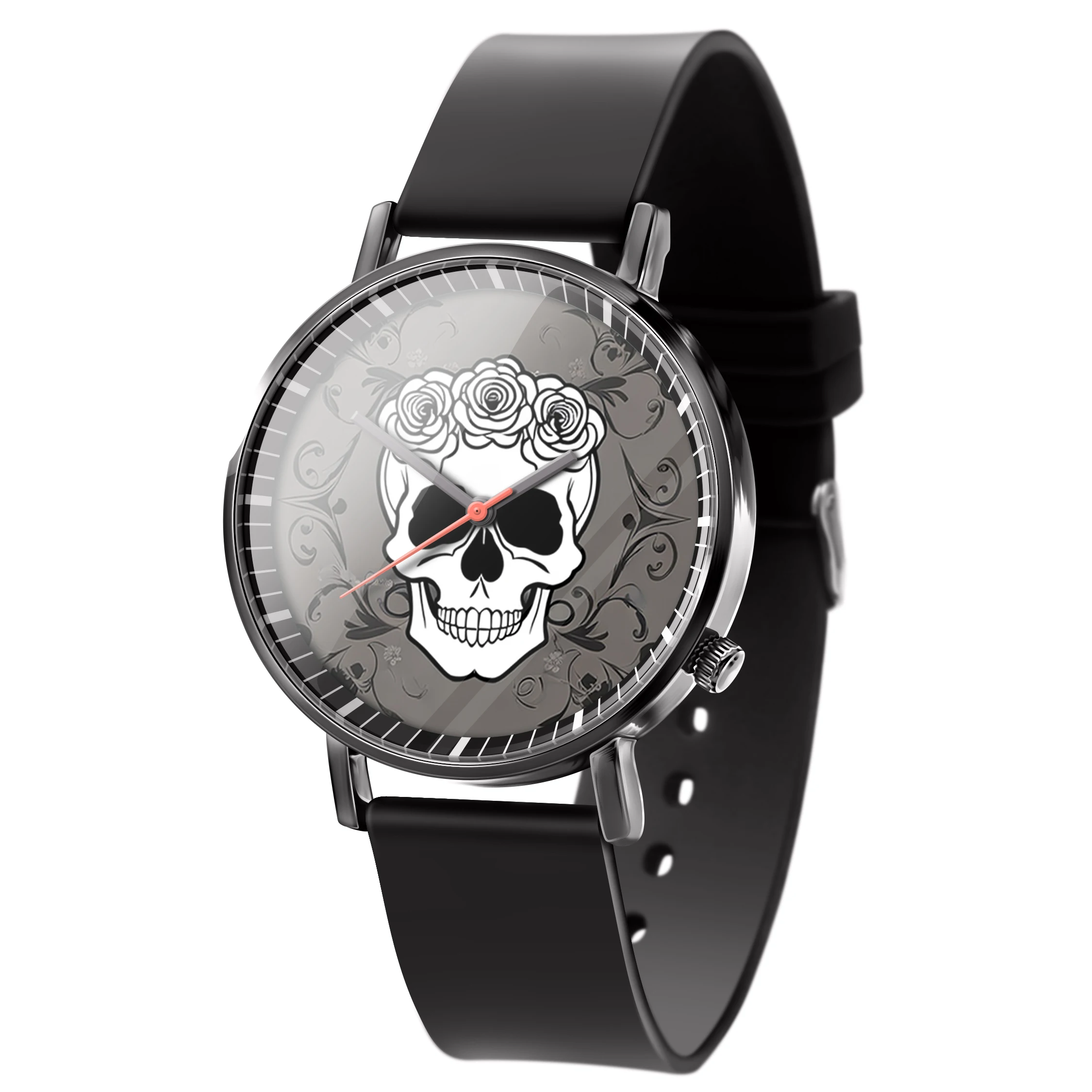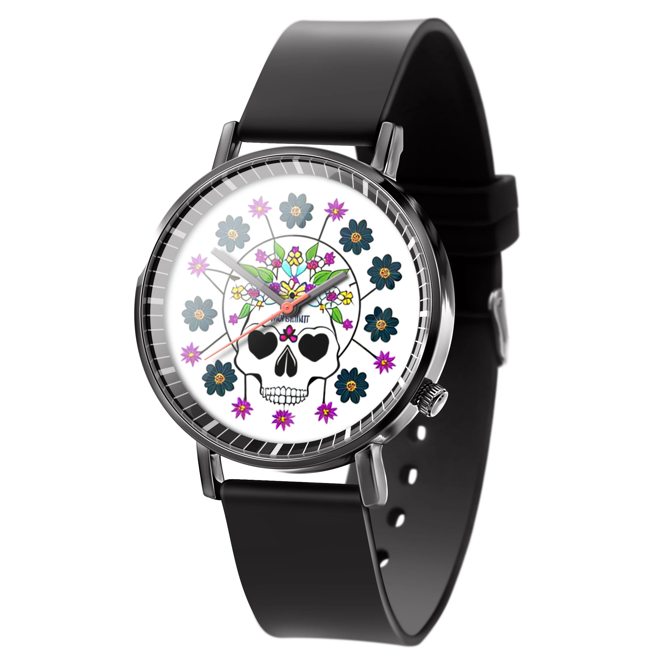 « Skullwatch »: Montre-bracelet à quartz tendance pour homme, crâne, fleurs noires et blanches. Mode, affaires, sport.