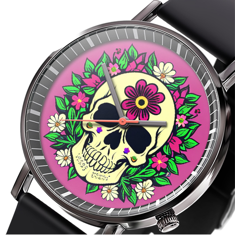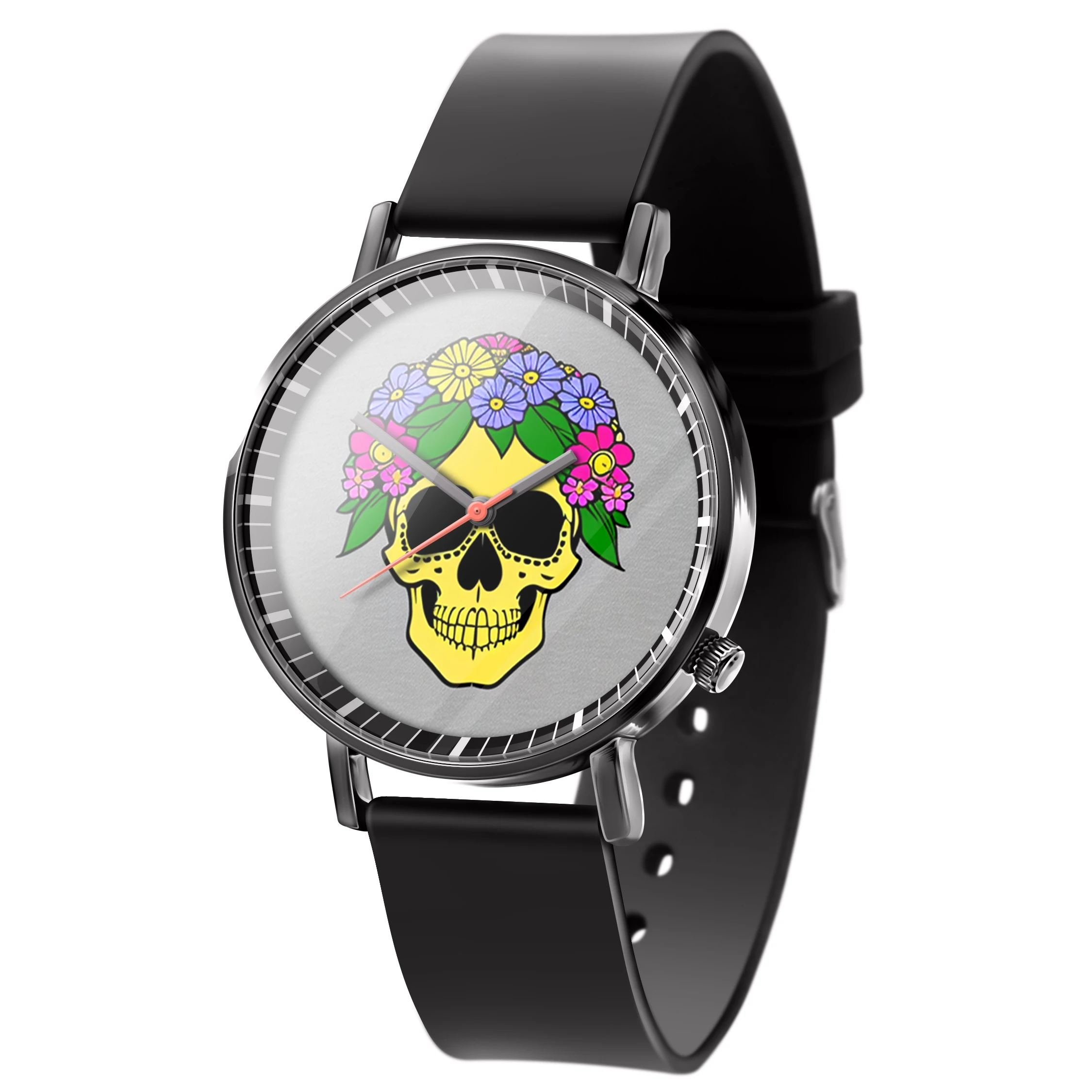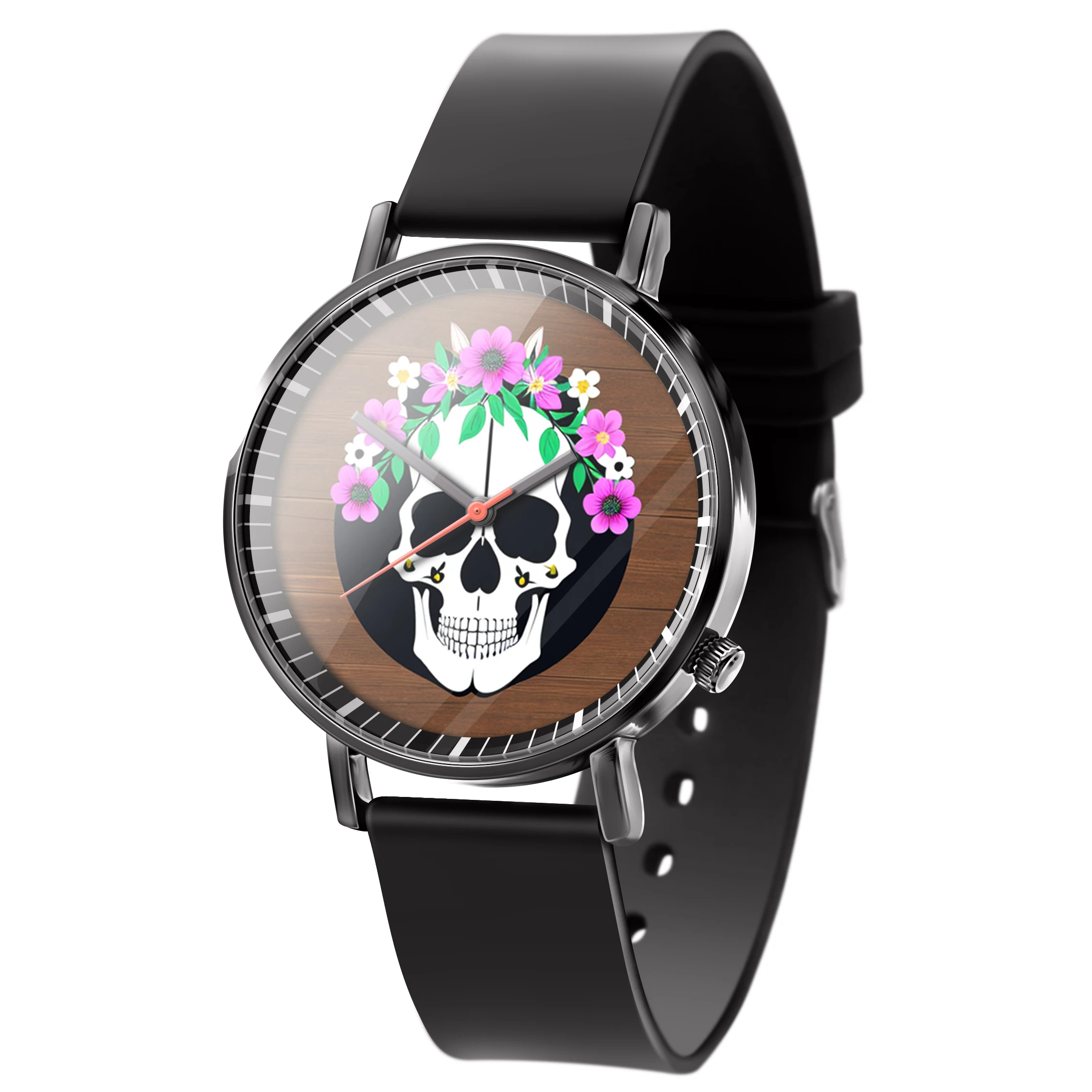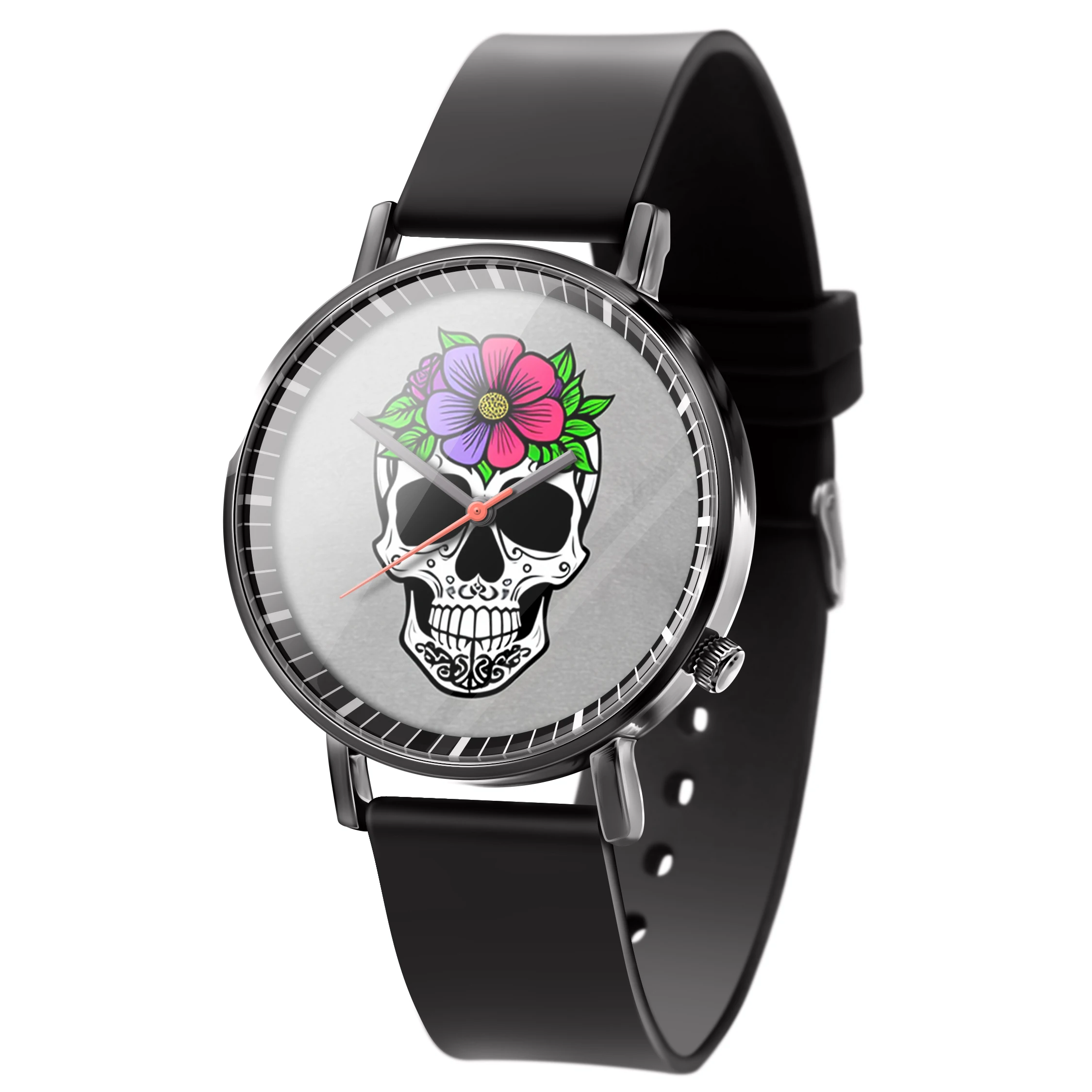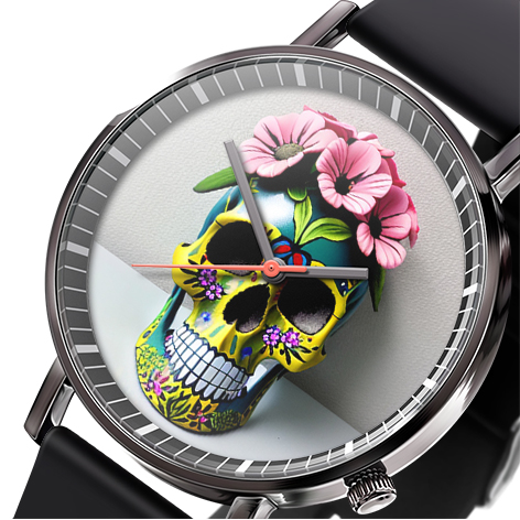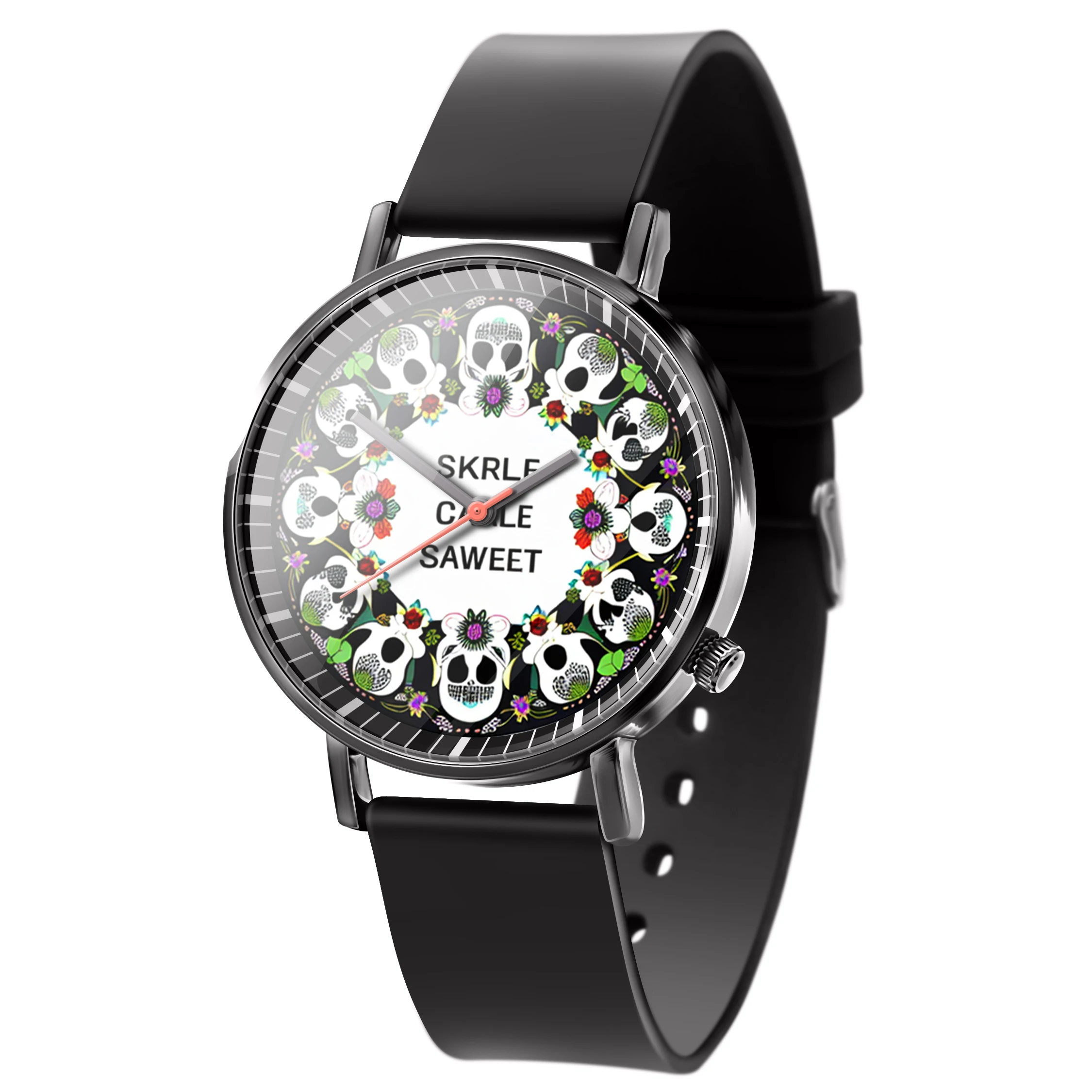 « Skullwatch »: Montre-bracelet à quartz tendance pour homme, crâne, fleurs noires et blanches. Mode, affaires, sport.