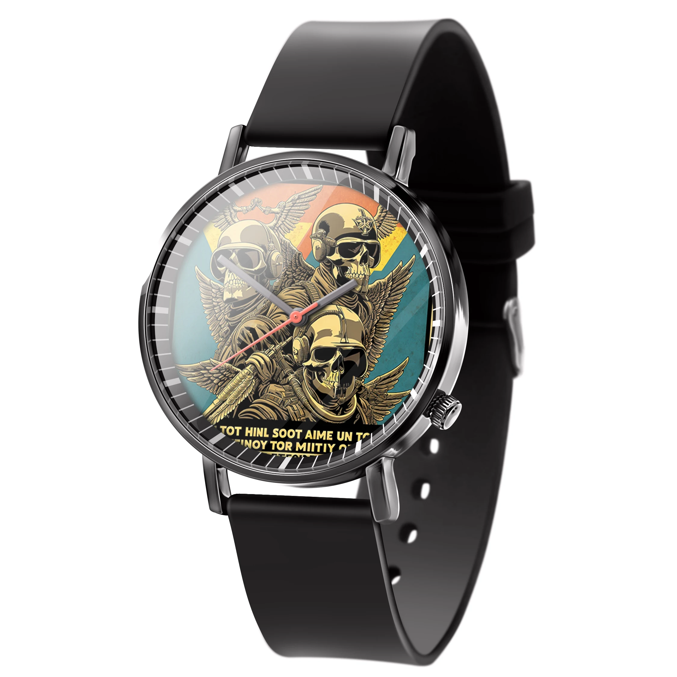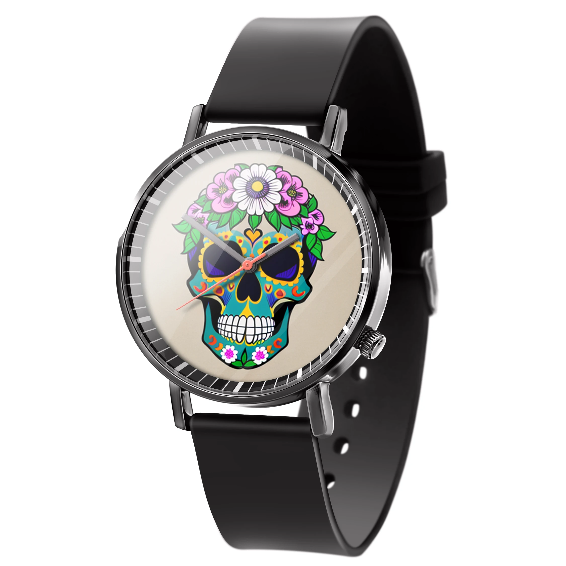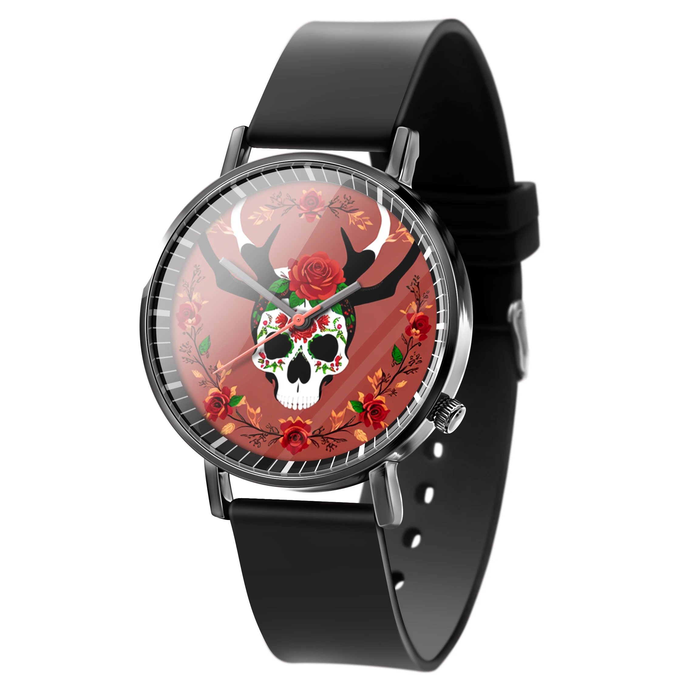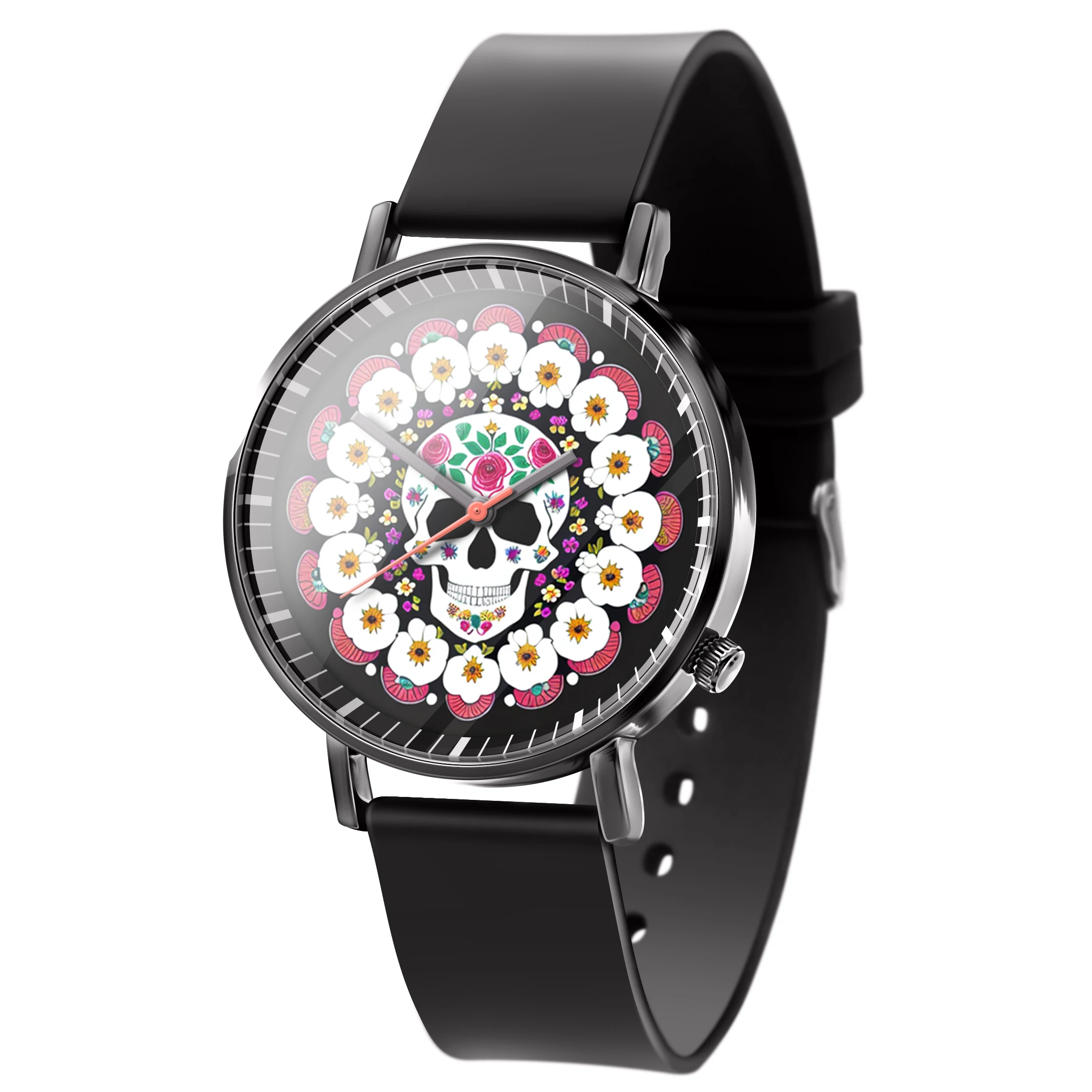 « Skullwatch »: Montre-bracelet à quartz tendance pour homme, crâne, fleurs noires et blanches. Mode, affaires, sport.