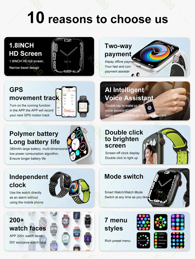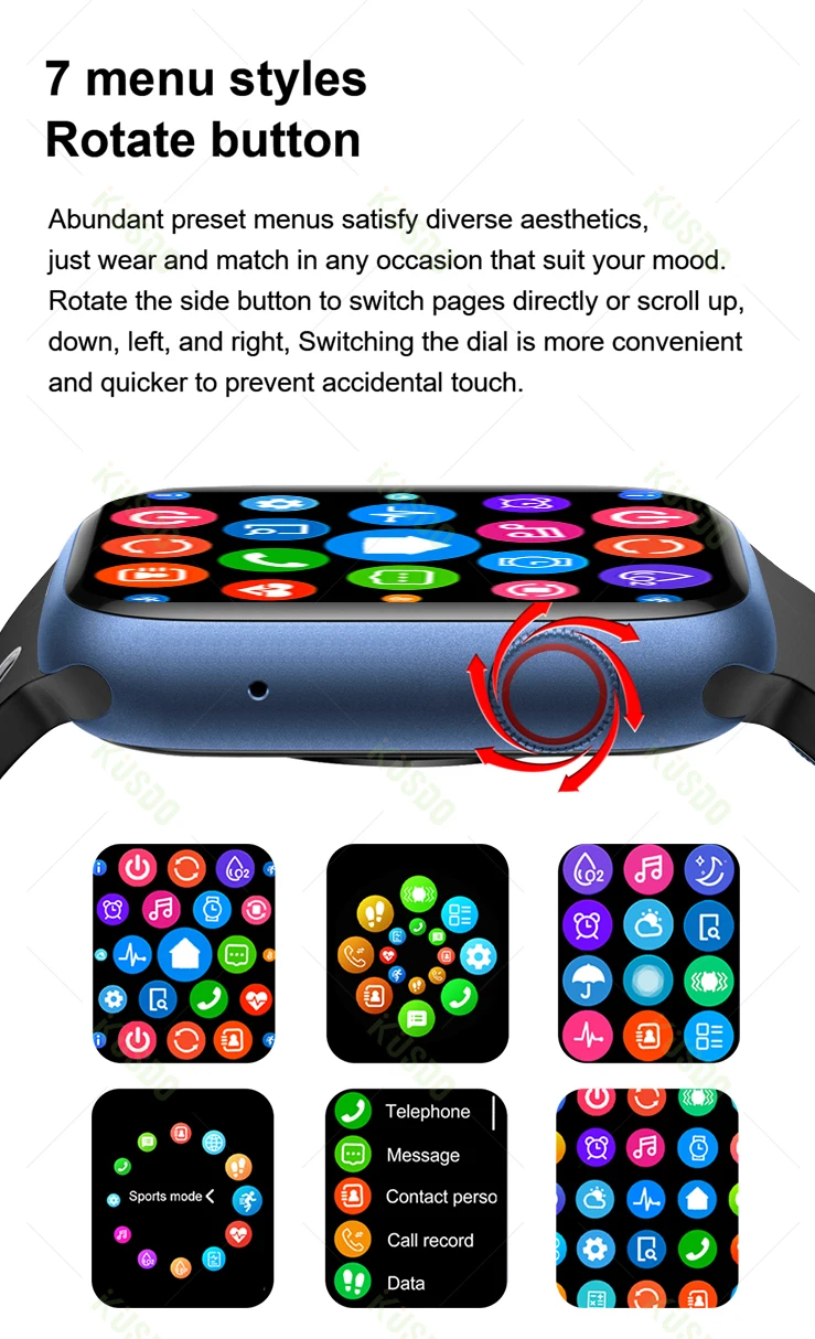 Abondante menus prédéfinis satisfaire diverses esthétiques, juste porter et match en toute occasion qui conviennent à votre humeur. Tourner le bouton latéral pour commutateur pages directement ou défiler vers le haut, bas, gauche, et droit, commutation le cadran est plus pratique et plus rapide pour éviter tout tactile.