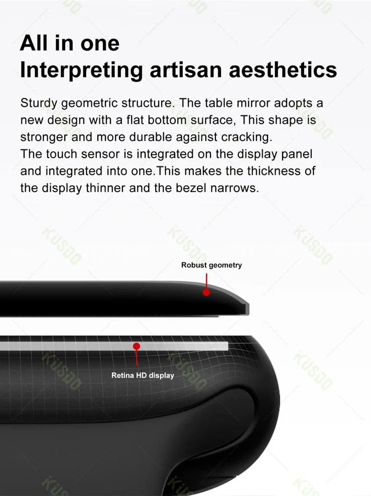 Robuste structure géométrique. Le miroir de table adopte un nouveau design avec un fond plat surface, cette forme est plus forte et plus durable contre la fissuration. Le capteur tactile est intégré sur le panneau d’affichage et intégré dans un. Ce qui rend l’épaisseur de il affichage plus mince et la lunette narrows.