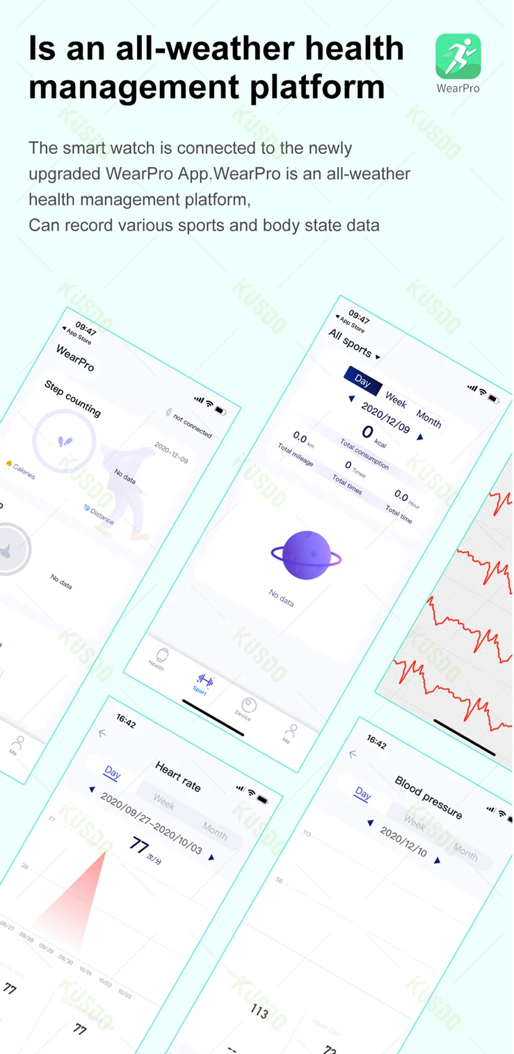 La smart watch est connecté à récemment mis à jour WearPro App. WearPro est un tout-temps santé plate-forme de gestion. Peut enregistrer différents sports et état du corps données
