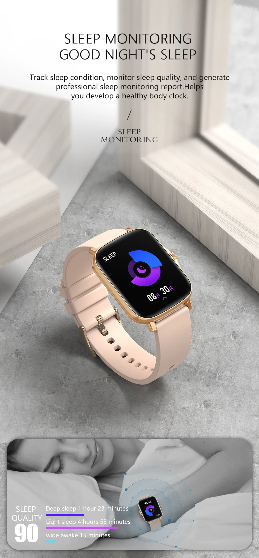 > Délassements: continu des activités toute la naissance, herméticité IP67, 8 Modes d’occupation, chronomètre, attache de hasard sportives.