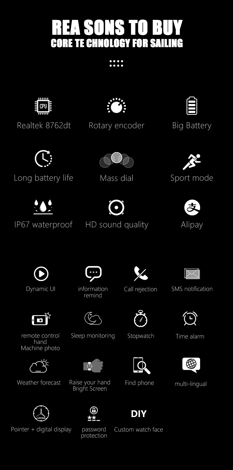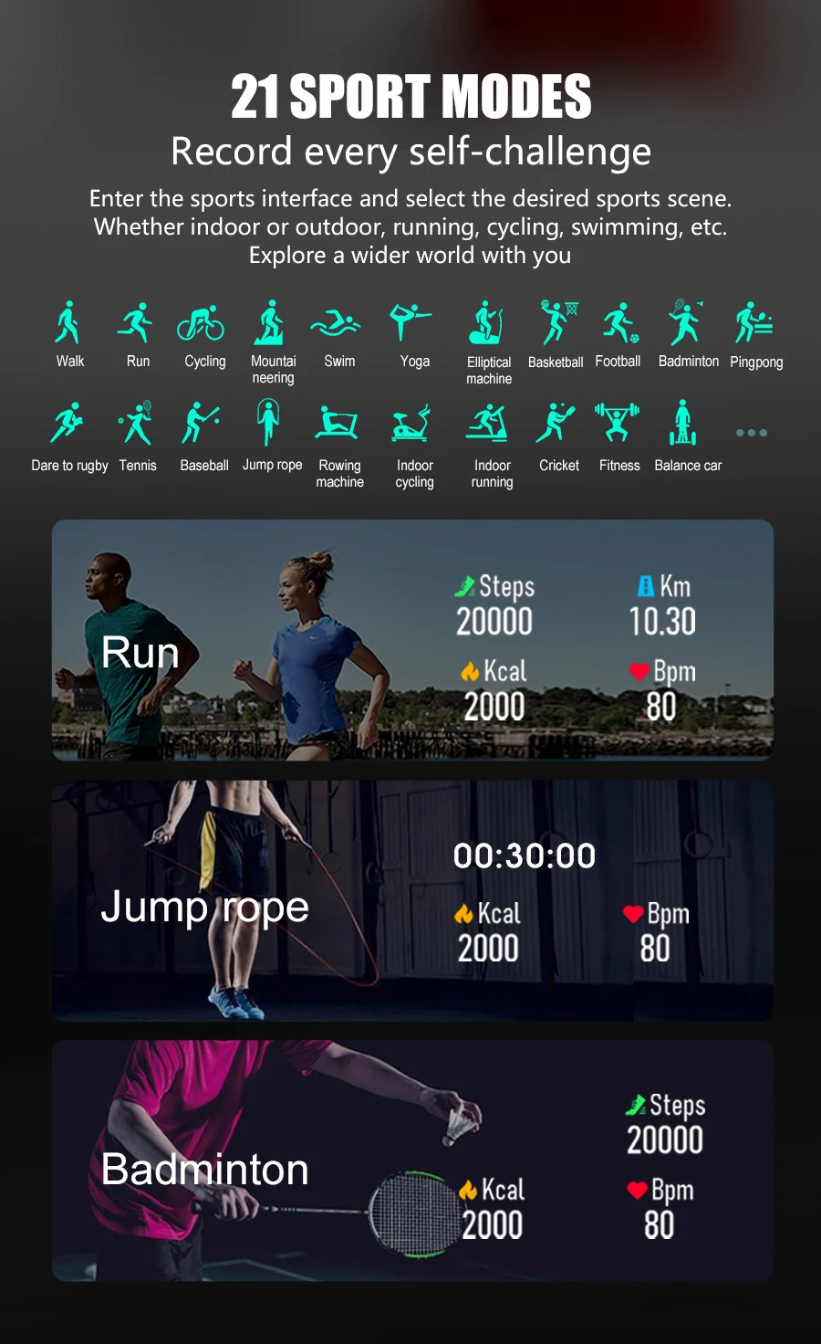 — Minuterie de soutien, podomètre, consommation de calories, calcul de Distance. Modes de sport: pompes, entraînement gratuit, course en plein air, cyclisme en plein air, course en salle, cyclisme en salle, redressements assis, à pied, alpinisme, etc.