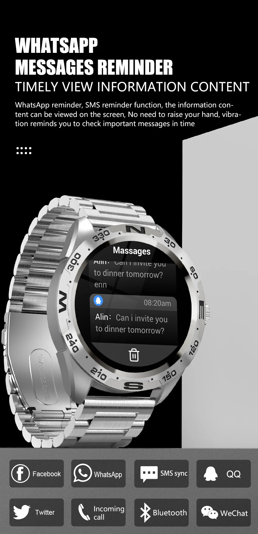 — Appels de soutien pour rappeler, rappel SMS, rappel de messagerie de tiers, poussée multilingue, alarme d’horloge, rappel de sédentarité.