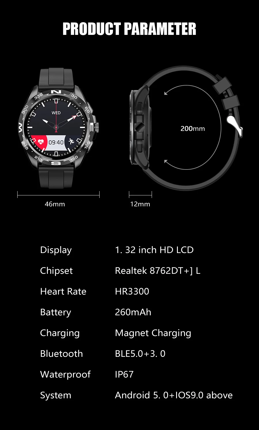 Montre connectée de Sport i32 pour les hommes, étanche conforme à la norme ip67, avec appels Bluetooth, écran de 2022 pouces, résolution de 1.32×360 pixels HD, pour android et ios, batterie de 360 mAh, 260