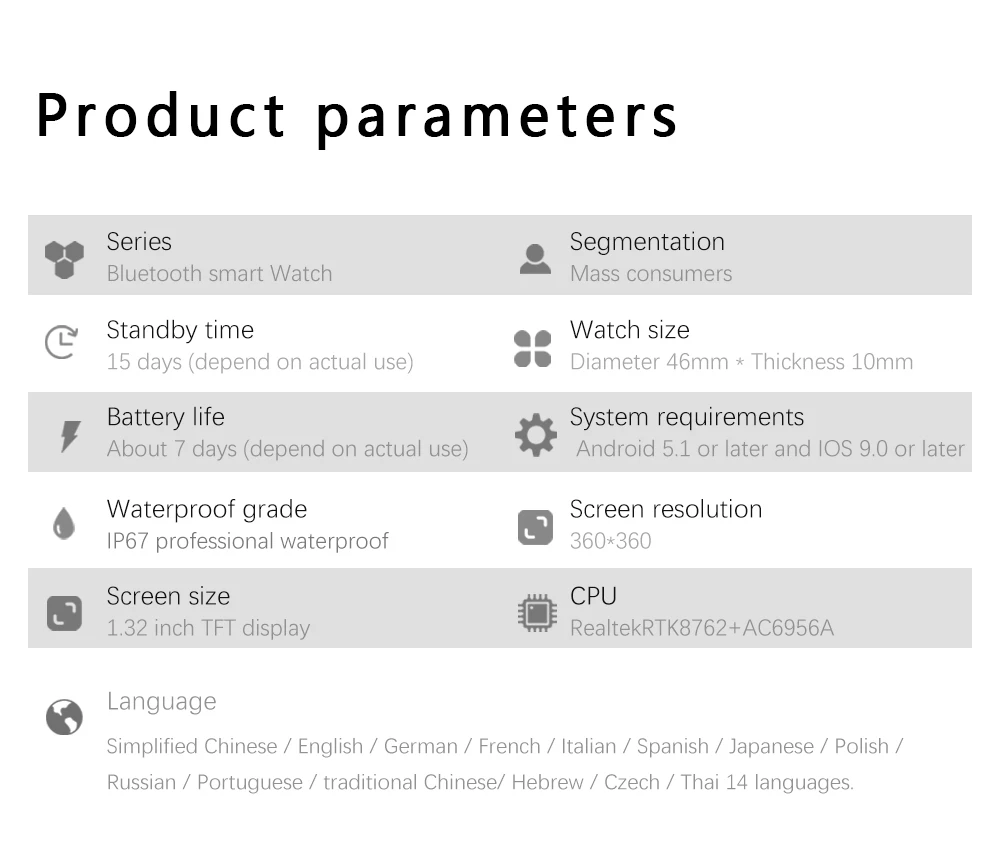 Langue: chinois simplifié/anglais/allemand/français/italien/espagnol/japonais/polonais/russe/portugais/chinois traditionnel/hébreu/tchèque/thaï 14 langues.