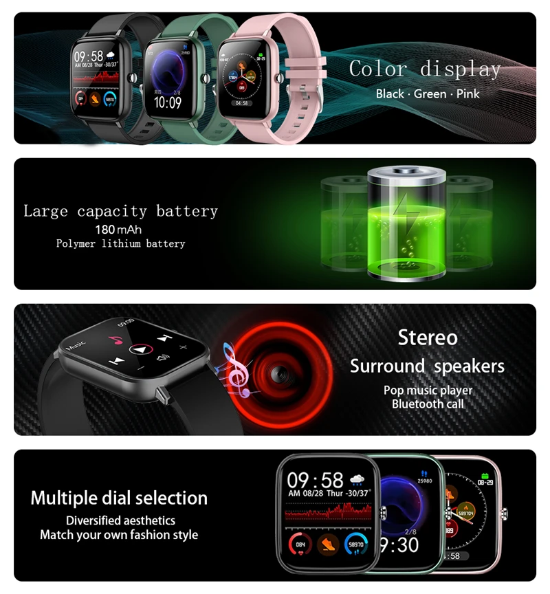 1. Garder un oeil sur votre santé: fréquence Cardiaque/sang pression/oxygène dans le sang surveillance, rappel sédentaire, sommeil tracker. 2. UNE bonne aide pour entraînement: Podomètre, distance, calories brûlées, sport modes. 3. UNE bonne aide pour la vie quotidienne: Bluetooth appels téléphoniques, contrôler la lecture de la musique sur le téléphone, sync notifications, appels entrants rappel, alarme, trouver mon appareil, jouer de la musique, chronomètre, élever poignet à réveil montre, personnalisé montre visages, etc.