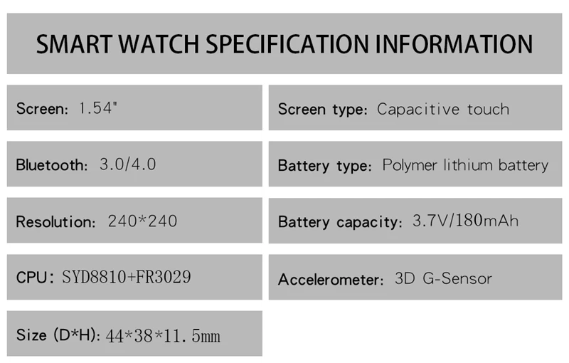 1. Modèle: P6 2. Dimensions: 44*38*11.5mm 3. Écran: TFT 4. Taille de l’écran: 1.54 pouces 5. Résolution: 240*240 6. Puce: SYD8810 + FR3029 7. RAM + Flash Mémoire: 24KB + 256KB 8. Bluetooth: 3.0 / 4.0 9. Capacité de La batterie: 180mAh 10. Manière de remplissage: clip de chargement 11. Temps de charge: 1.5h 12. Autonomie de La batterie: 7 jours 13. Mode tactile: entièrement tactile 14. APP:HryFine 15. Configuration requise: Android5.0 + / IOS9.0 +