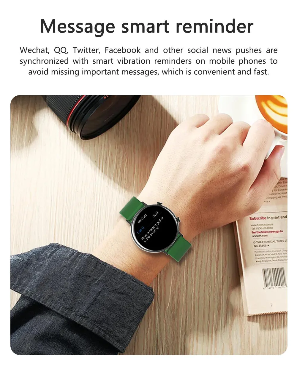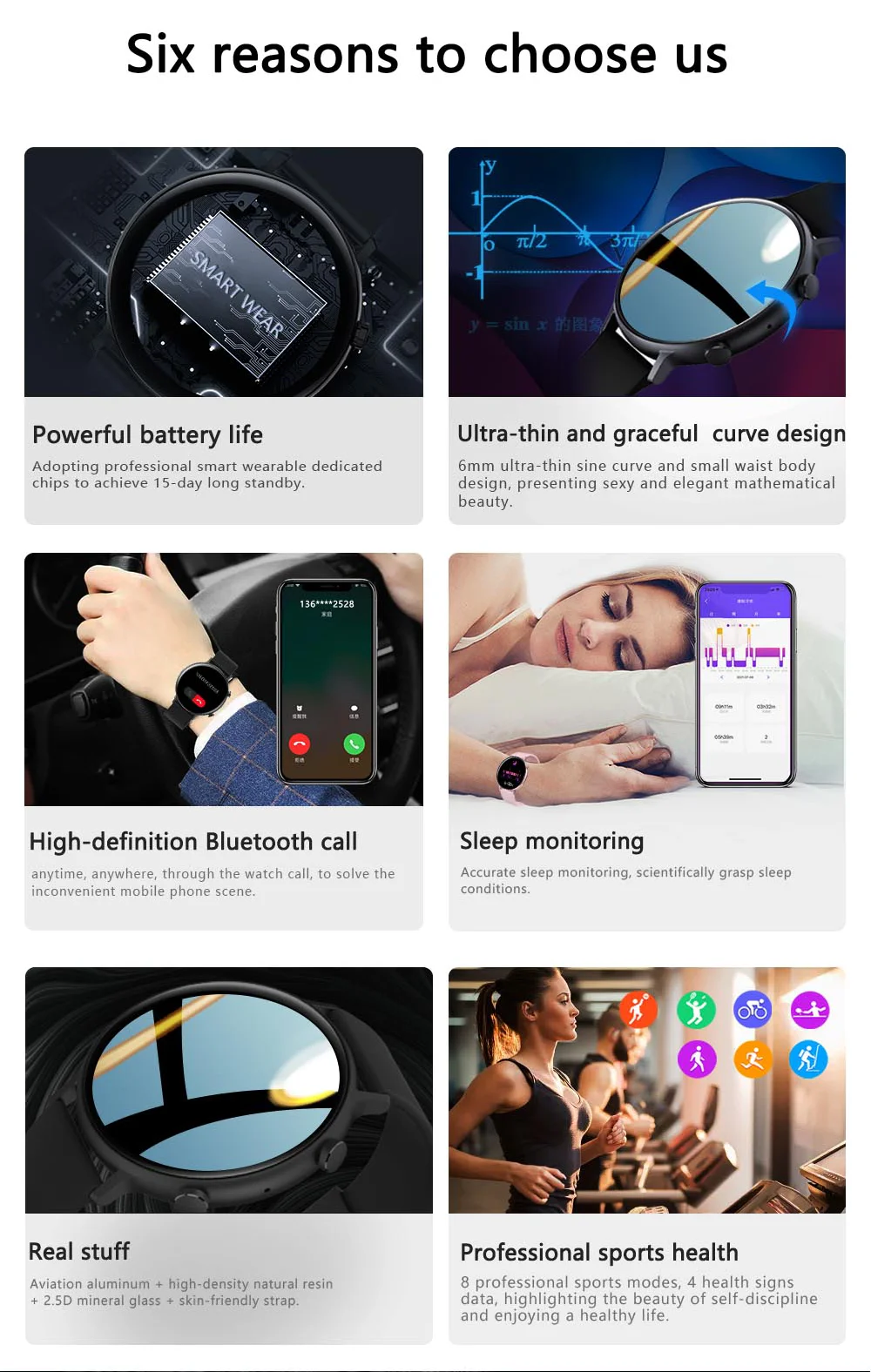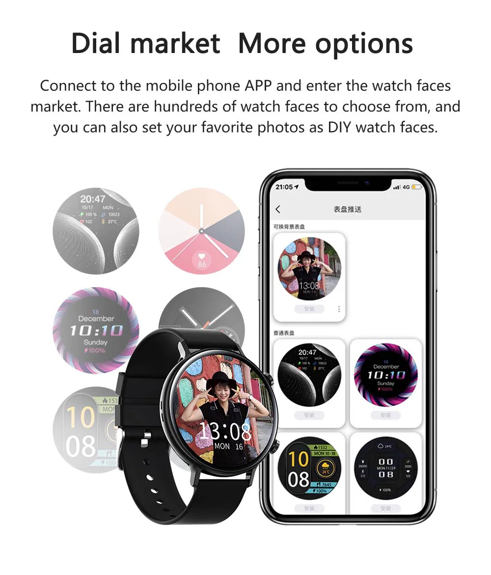 Capteur de fréquence cardiaque, microphone, boutons, commutation de numérotation multiple, commutation de style d’interface utilisateur multiple, marché de numérotation, support y compris SMS, QQ, Wechat, Twitter, Facebook, linkedIn, Skype, whatsapp, ligne, viber, instagram et autres messages en temps réel., Rappel d’appel, appel Bluetooth, contrôle de la musique Bluetooth, surveillance de la fréquence cardiaque, mesure de la pression artérielle/oxygène sanguin/ECG, indice de stress, cycle physiologique, podomètre, calories, surveillance du sommeil, plusieurs modes d’exercice, réveil, chronomètre, compte à rebours, mode ne pas déranger, levez le poignet pour éclairer l’écran, Trouver un téléphone portable, prendre des photos à distance, etc.