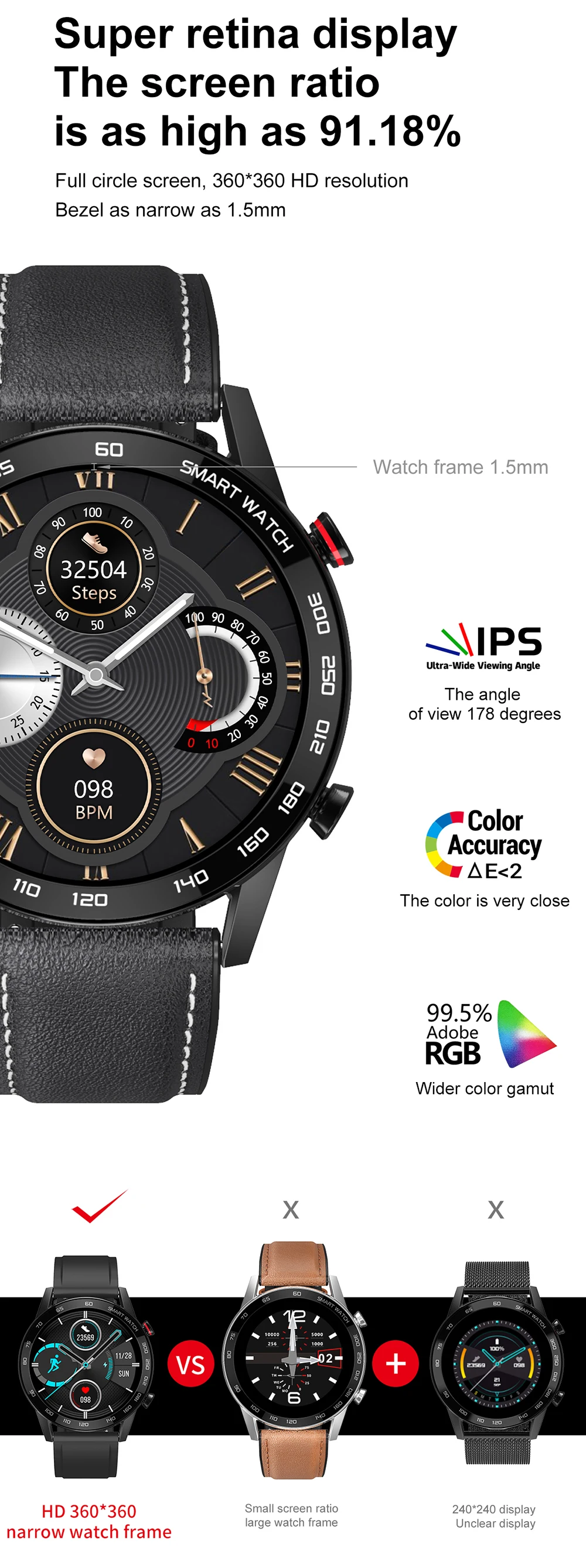 * Points trousseau: herméticité IP68, retenue retina ballonné entier de 1.3 pouces 360*360, autarcie de la fortification de 7 jours