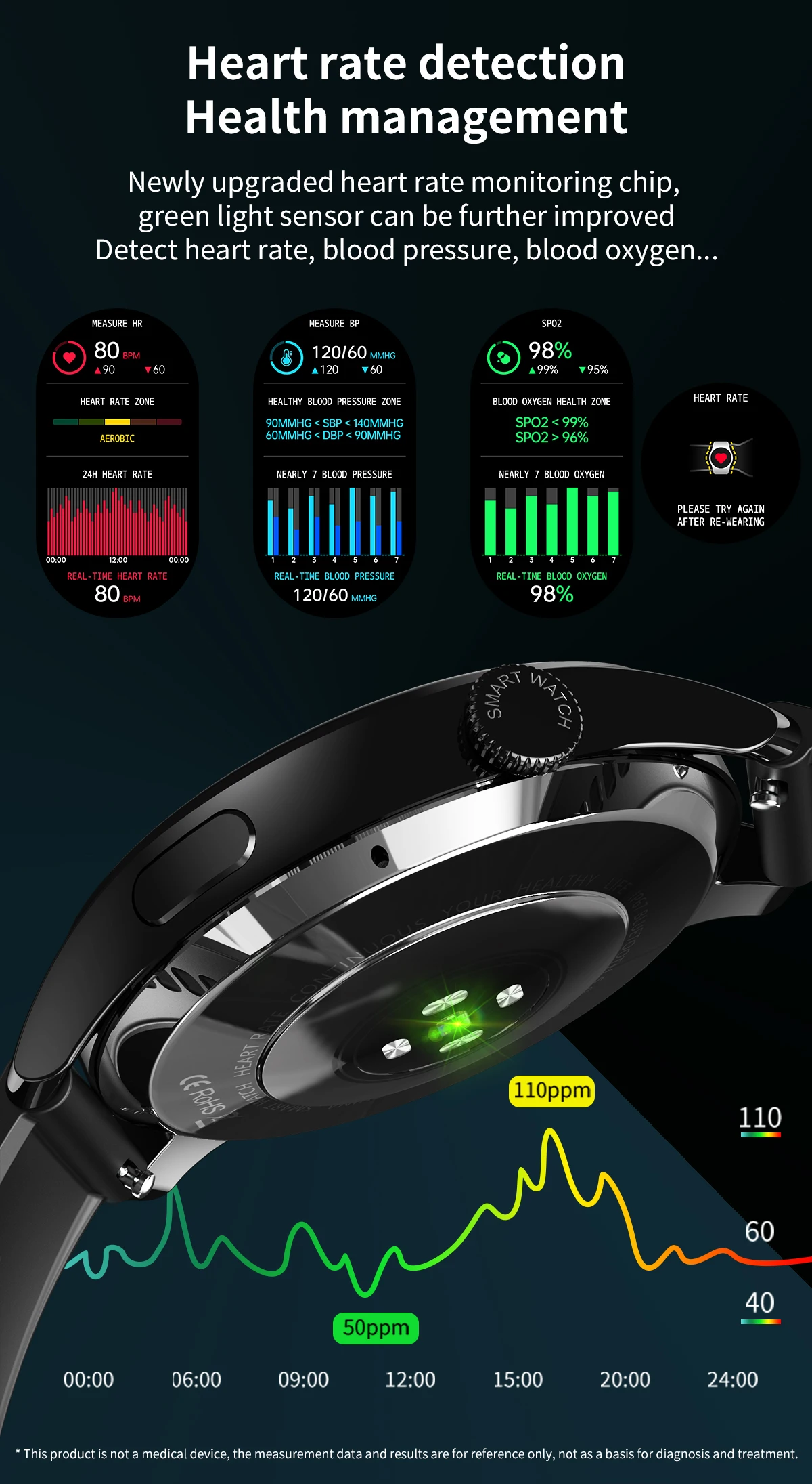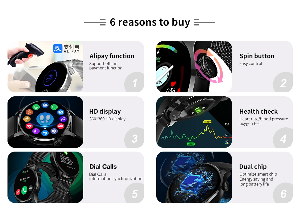 Étanchéité IP67, mesure de la pression artérielle, mesure de l’oxygène dans le sang, surveillance du sommeil, rappel d’alarme, rejet d’appel, réponse d’appel, appel d’appel, lecture de musique, réglage de la luminosité de l’écran, synchronisation météo, synchronisation des contacts, appel de harcèlement (affichage d’appel de harcelement intégré), et plus de mode d’exercice, rappel de sédentarité, rappel de consommation d’alcool, Exercice de respiration, rappel d’appel/rappel SMS, message texte, WeChat, QQ, Twitter Facebook, etc. 10 types de push (en option tout push), exercice WeChat, fréquence cardiaque dynamique, caméra à distance, sélection du visage de la montre, télécommande de la musique