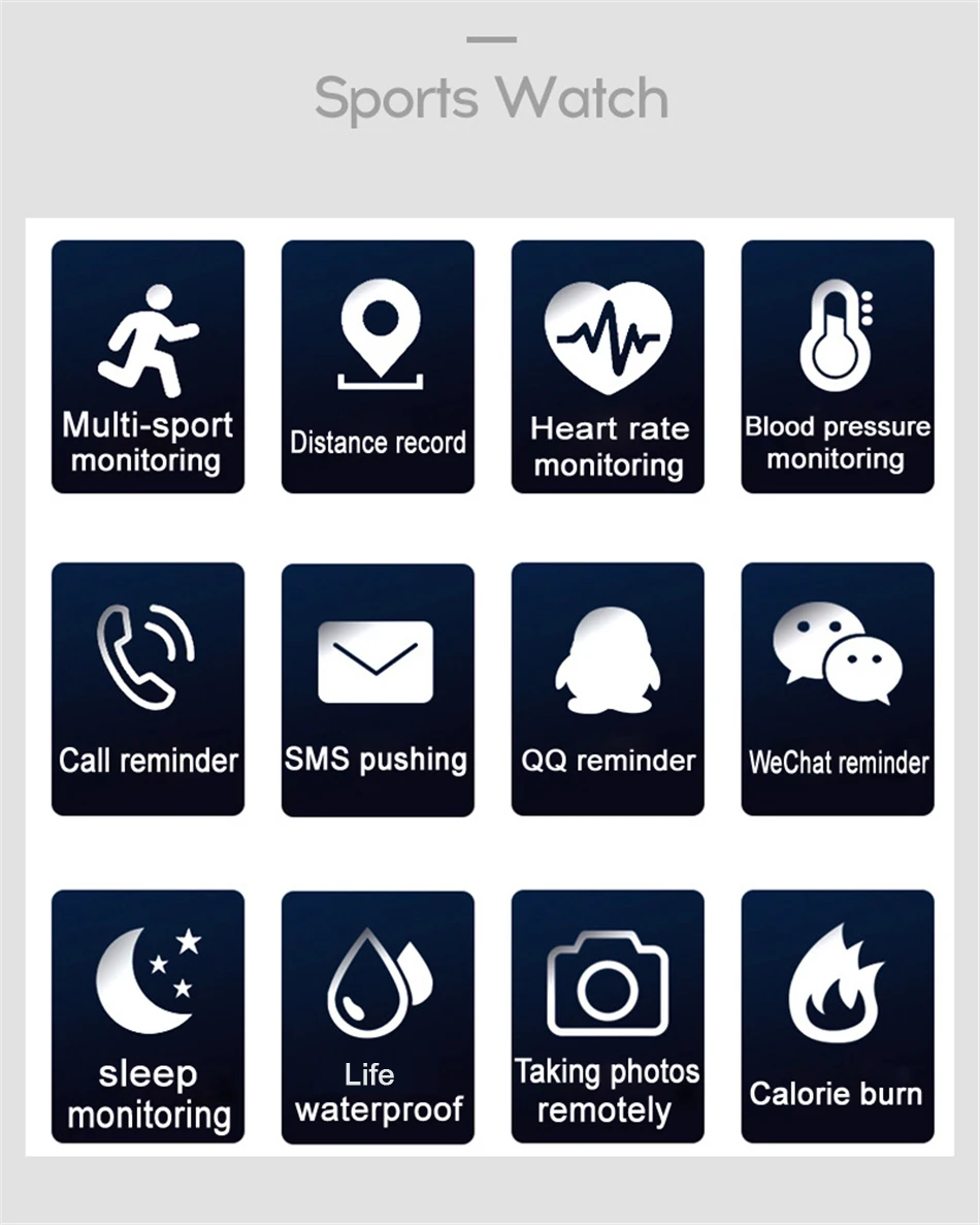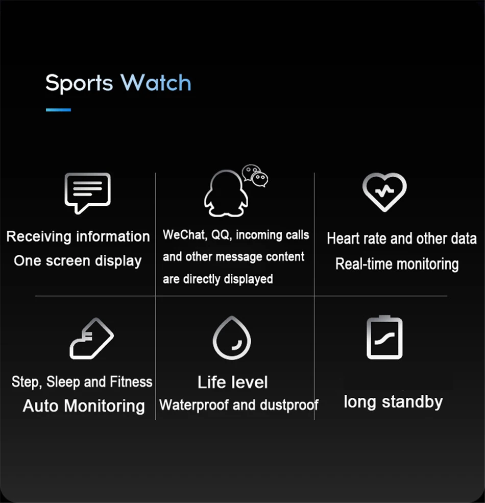 Écran couleur de 0,96 pouces, clair pour voir même sous la lumière du soleil, surveiller vos informations sportives à tout moment, IP67 étanche, vous pouvez vous laver les mains lorsque vous le portez ou le portez sous la pluie, mais il vaut mieux ne pas le porter pour nager.