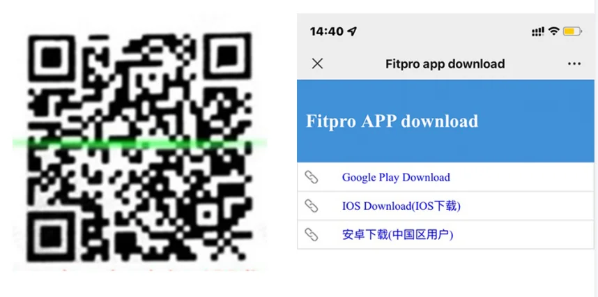 Scannez le QR code pour télécharger le QR code de l’utilisateur manuel, télécharger l’application mobile et connecter le montre, après l’opération est terminée, le temps, langue et d’autres données de la montre sera synchronisé avec le mobile téléphone