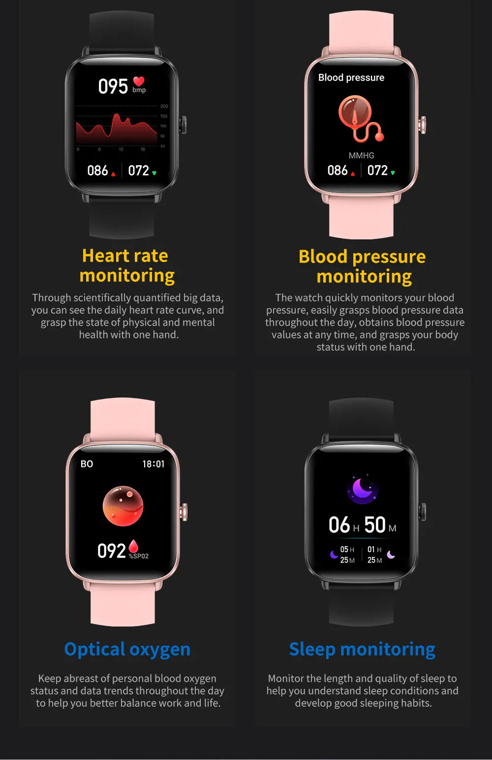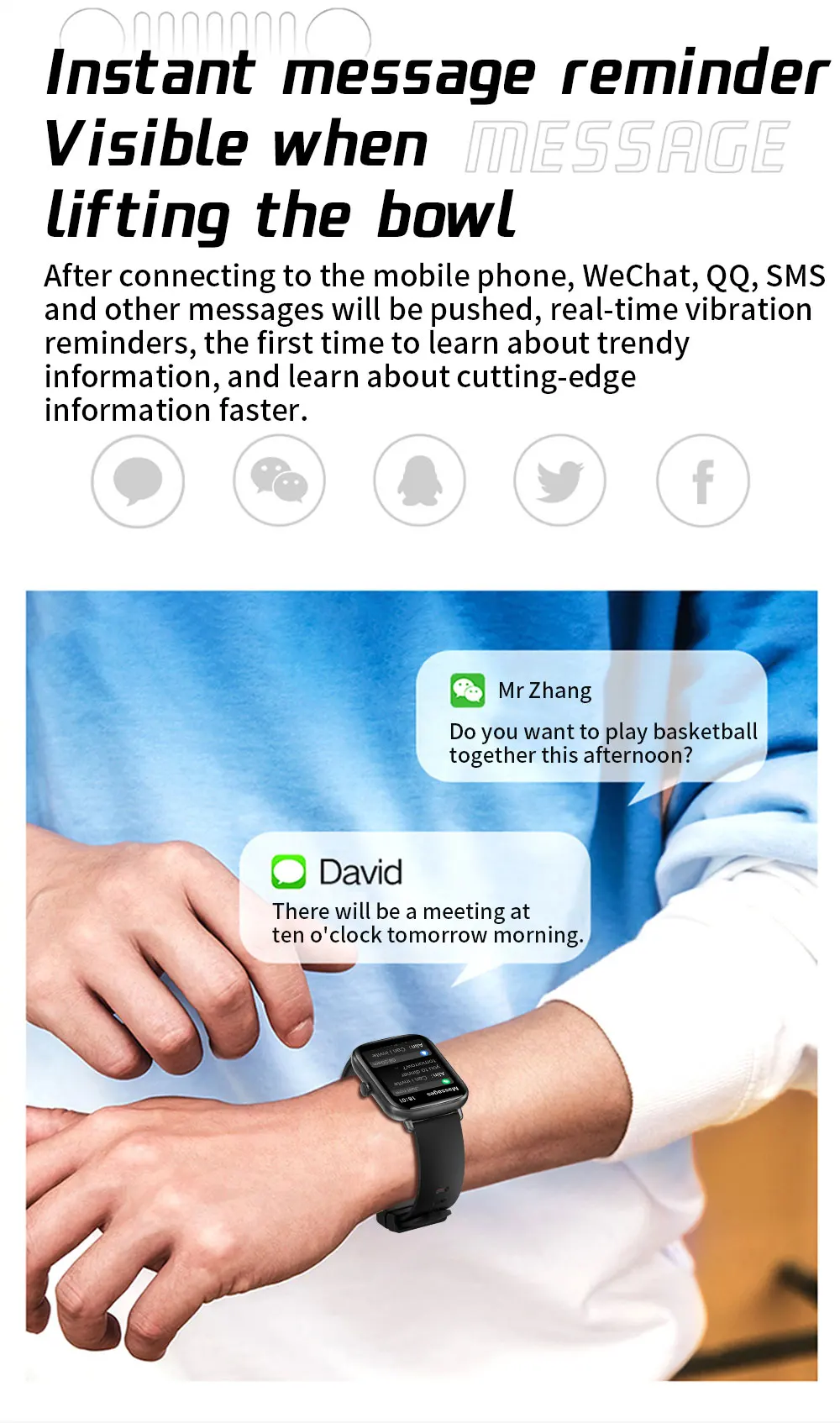 Rappel d’information il y a des commutateurs d’activation de fonction du côté de l’application (appels entrants, messages texte, Wechat, QQ, Facebook, Twitter, LinkedIn, WhatsApp, Line, Instagram, Snapchat, skype et autres applications mobiles) et événements tels que assis, réveil, eau potable, prise de médicaments, Etc. Rappel d’information, réveil, photo, écran de poignet relevé, rappel sédentaire, chronomètre, compte à rebours, recherche de téléphone portable, réglage de la luminosité du bracelet, réglage de la durée de l’écran du bracelet, comptage des pas, synchronisation des données de fréquence cardiaque prise en charge de l’application, exercice, kilométrage, calories, pas, sommeil, sommeil total, profond, Temps de sommeil léger, record historique, fréquence cardiaque, tension artérielle, sommeil, exercice