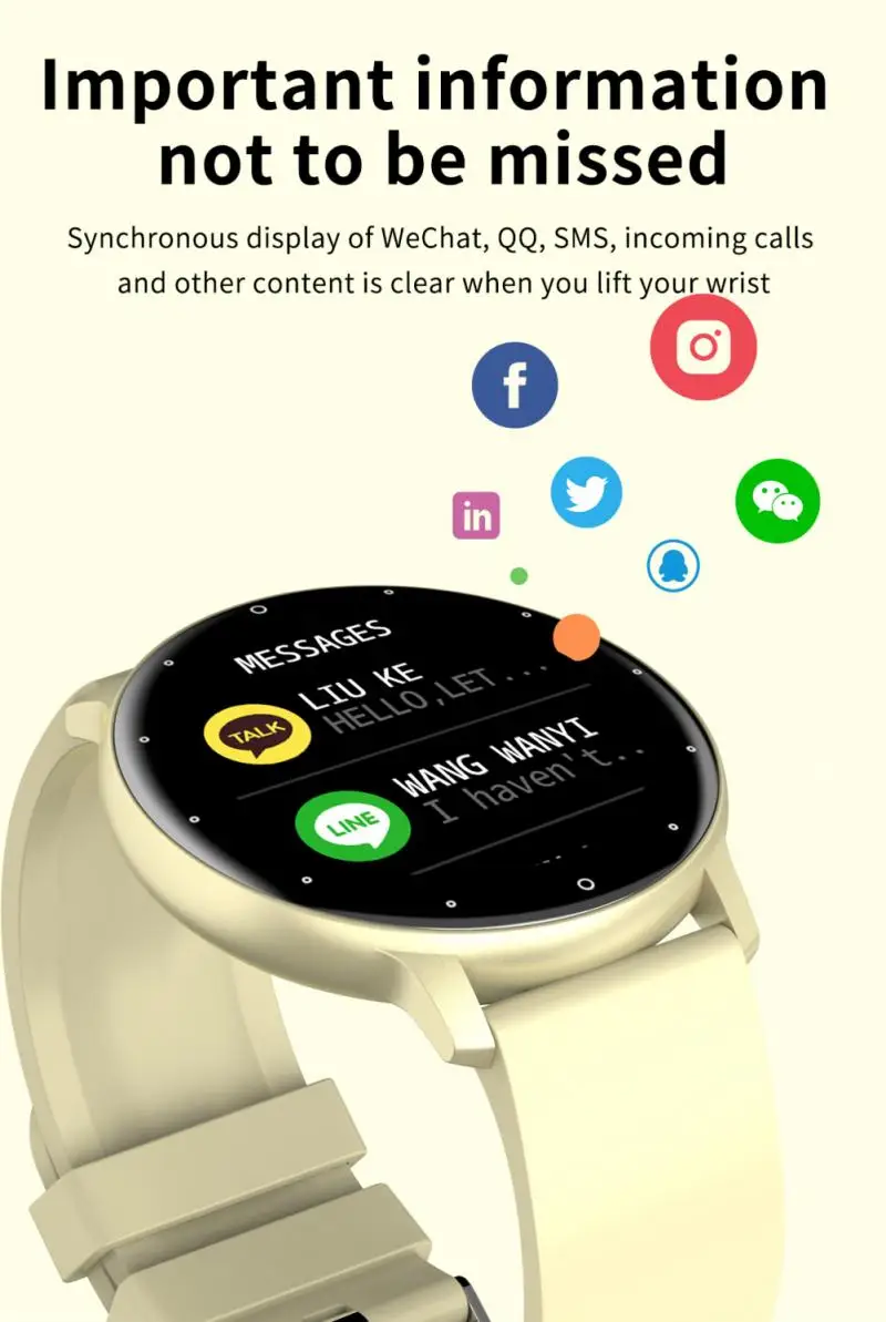 Affichage de la fréquence cardiaque/heure/date, pas, distance, calories, surveillance du sommeil, rappel d’appel, rappel de message d’application sociale, rappel de sédentarité, rappel d’information il y a des commutateurs d’activation de fonction du côté de l’application (appel entrant, SMS, Wechat, QQ, Facebook, Twitter, linkdin, WhatsApp, Line, Instagram, Snapchat, Skype et autres applications de téléphone portable) et rappels d’informations sur les événements tels que sédentaire, réveil, eau potable, médicaments, etc., prendre des photos à distance, lever le poignet pour éclairer l’écran, changer le format, chronomètre, trouver le téléphone, chronomètre