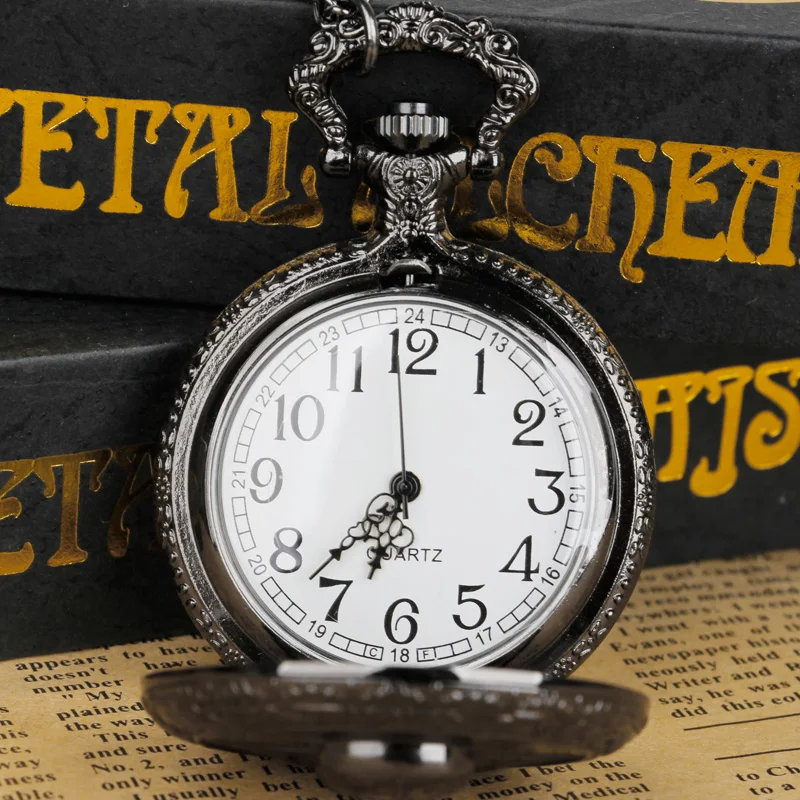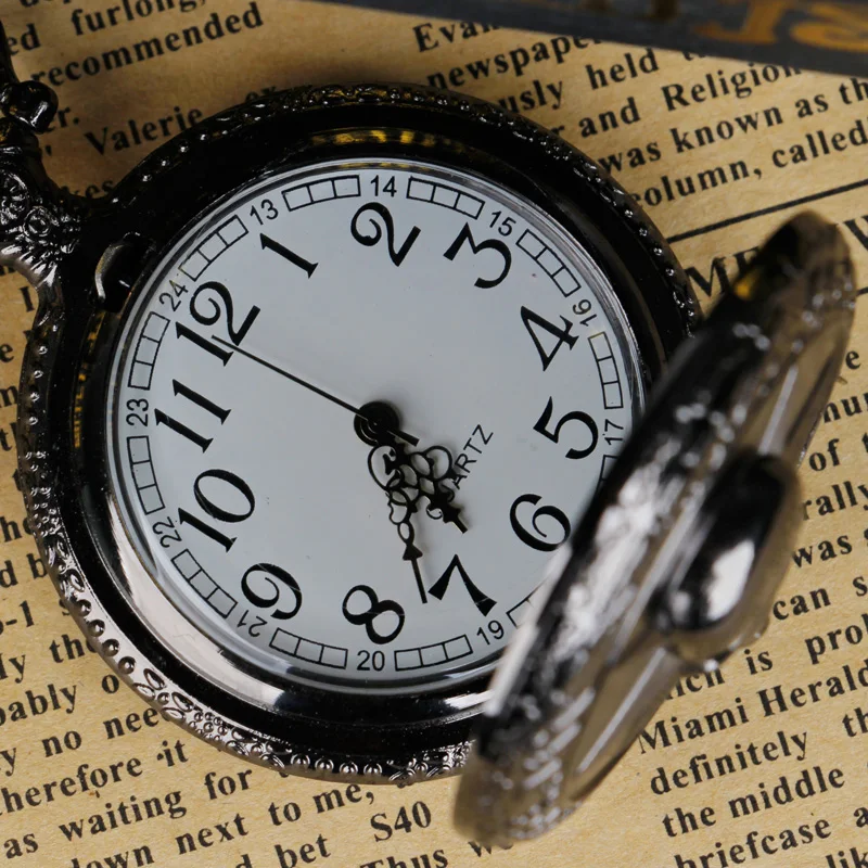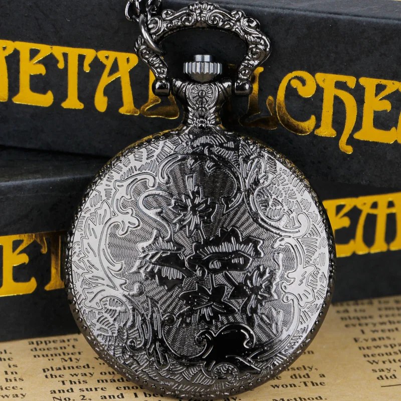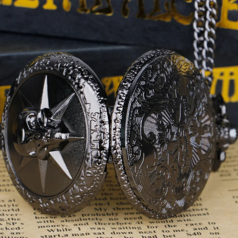 Le look Steam Street Punk avec la montre de poche à quartz noire sculptée tête de mort pour homme