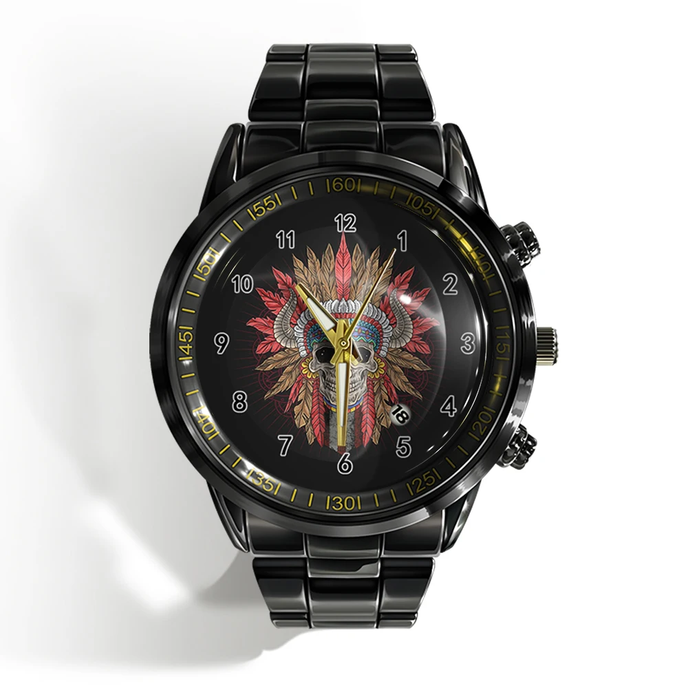 Crâne de luxe : Montre-bracelet pour homme avec calendrier, noir et blanc.
