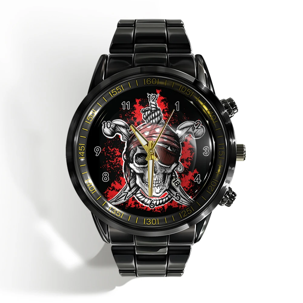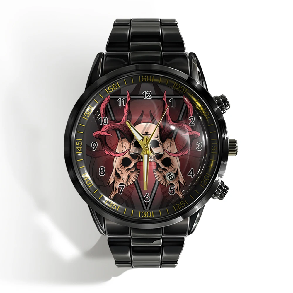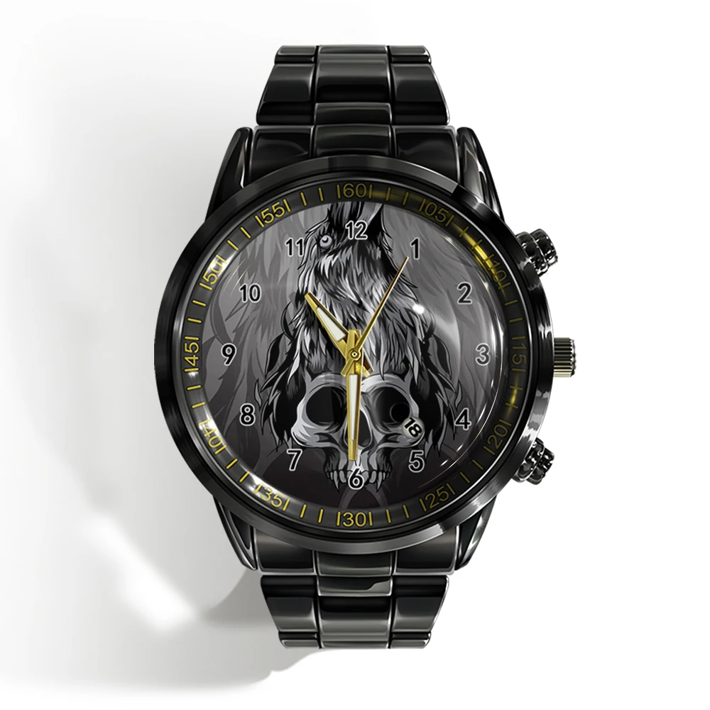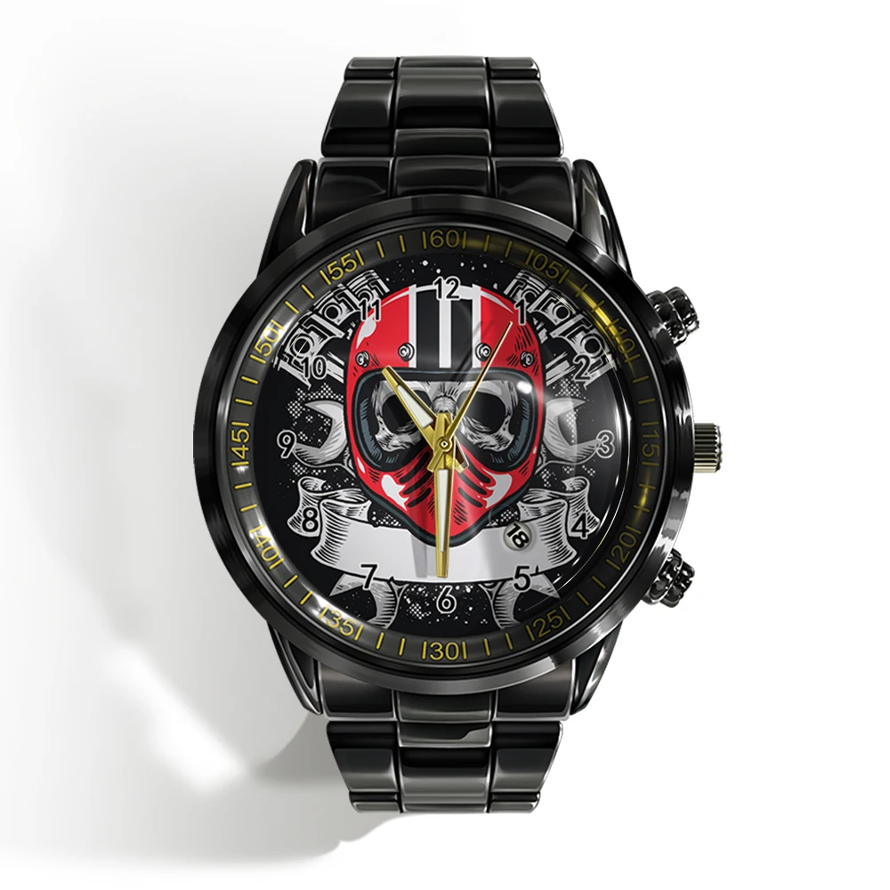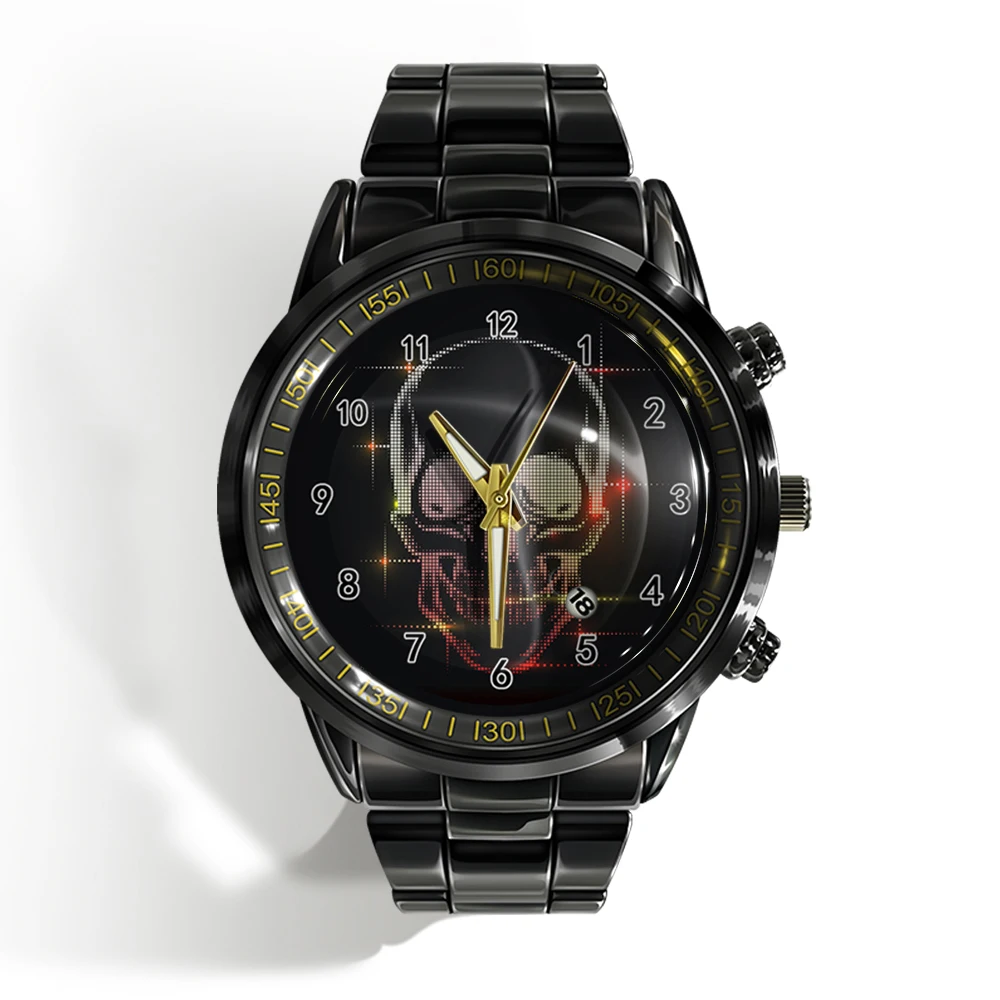 « Skull Watch »: Montre-bracelet de luxe pour homme avec calendrier, crâne d’horreur et plat noir et blanc.