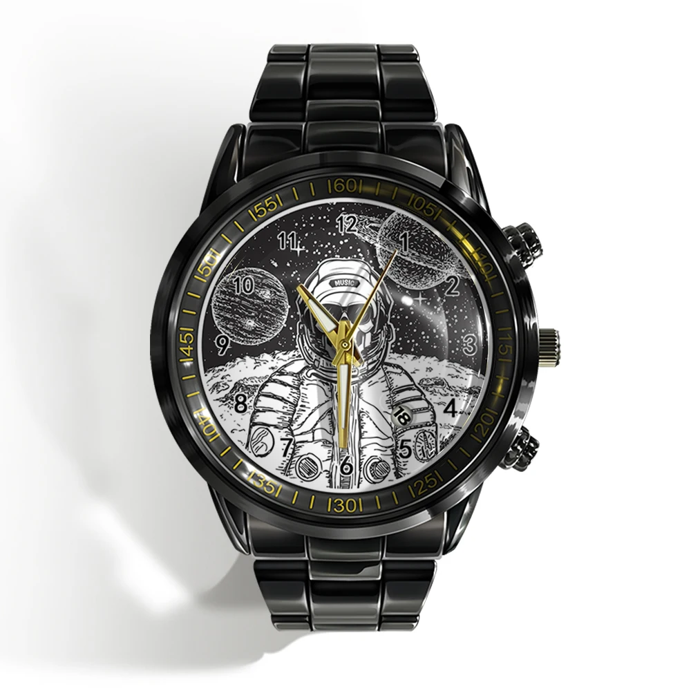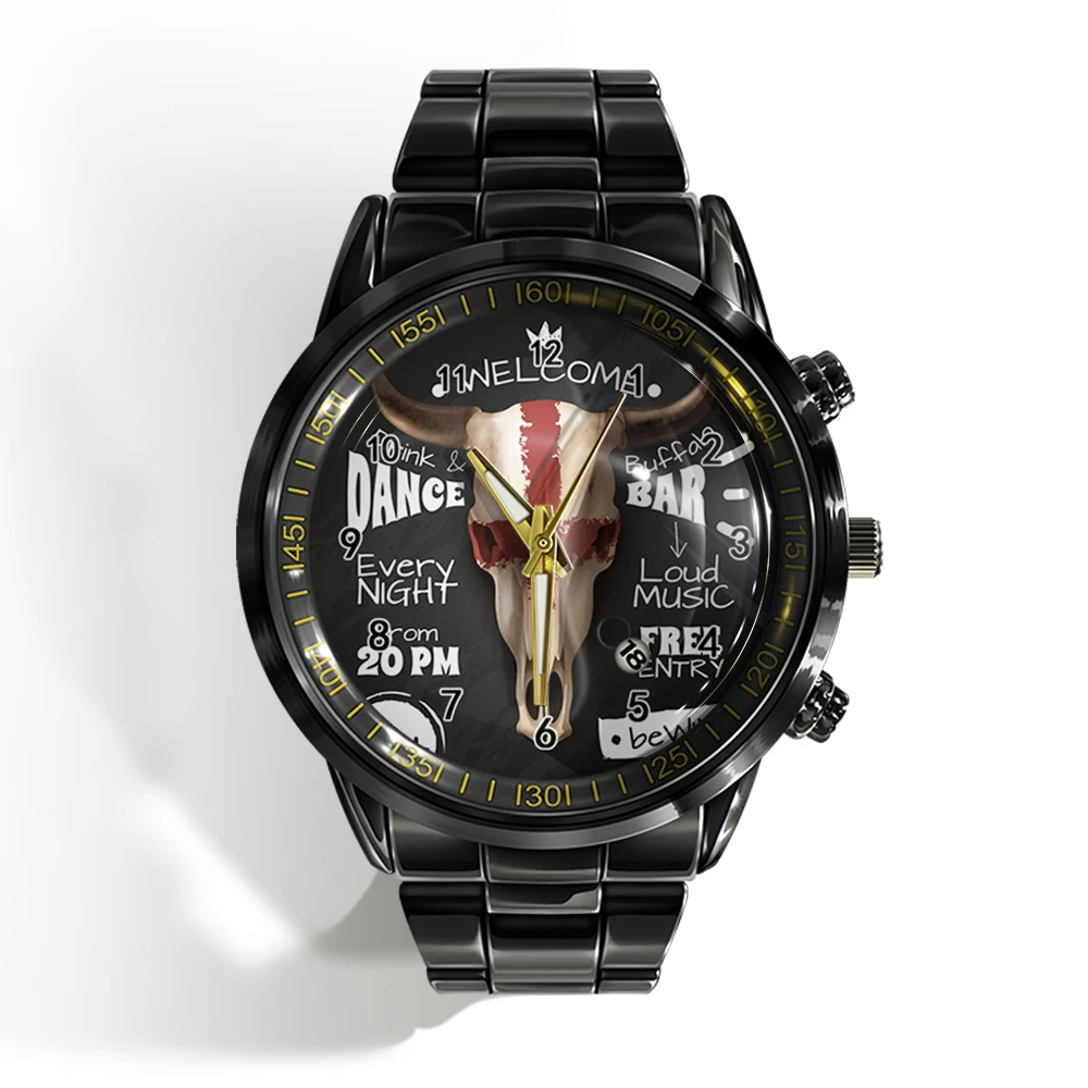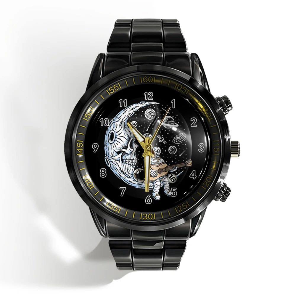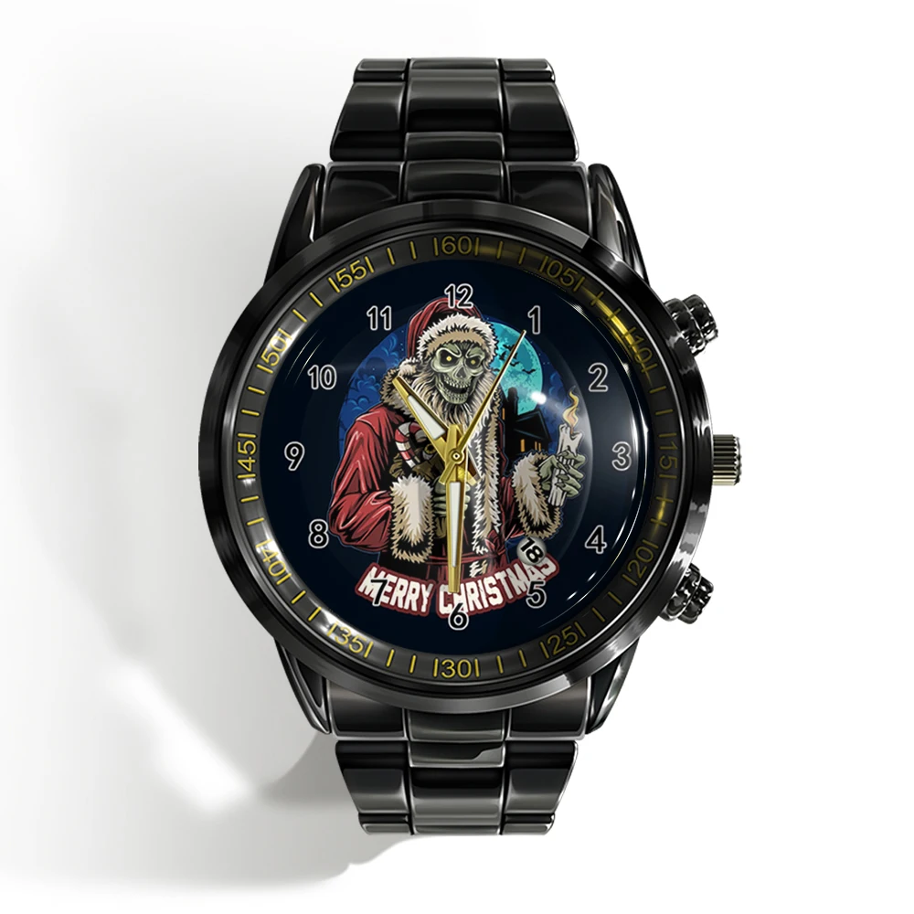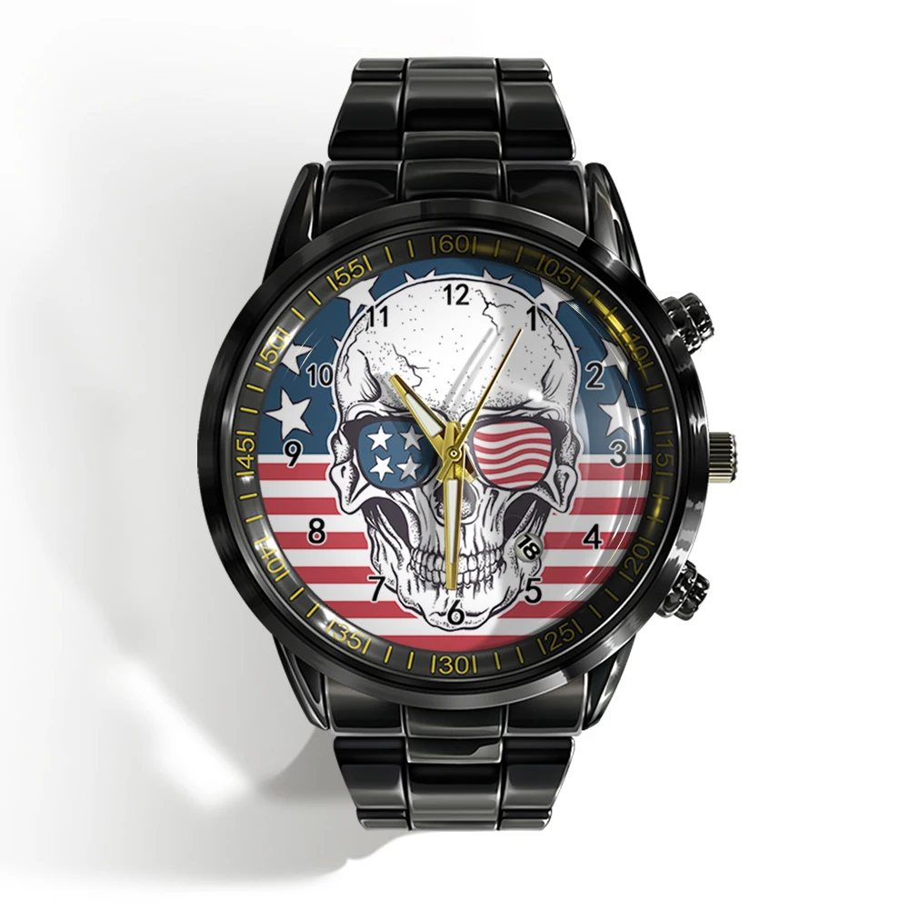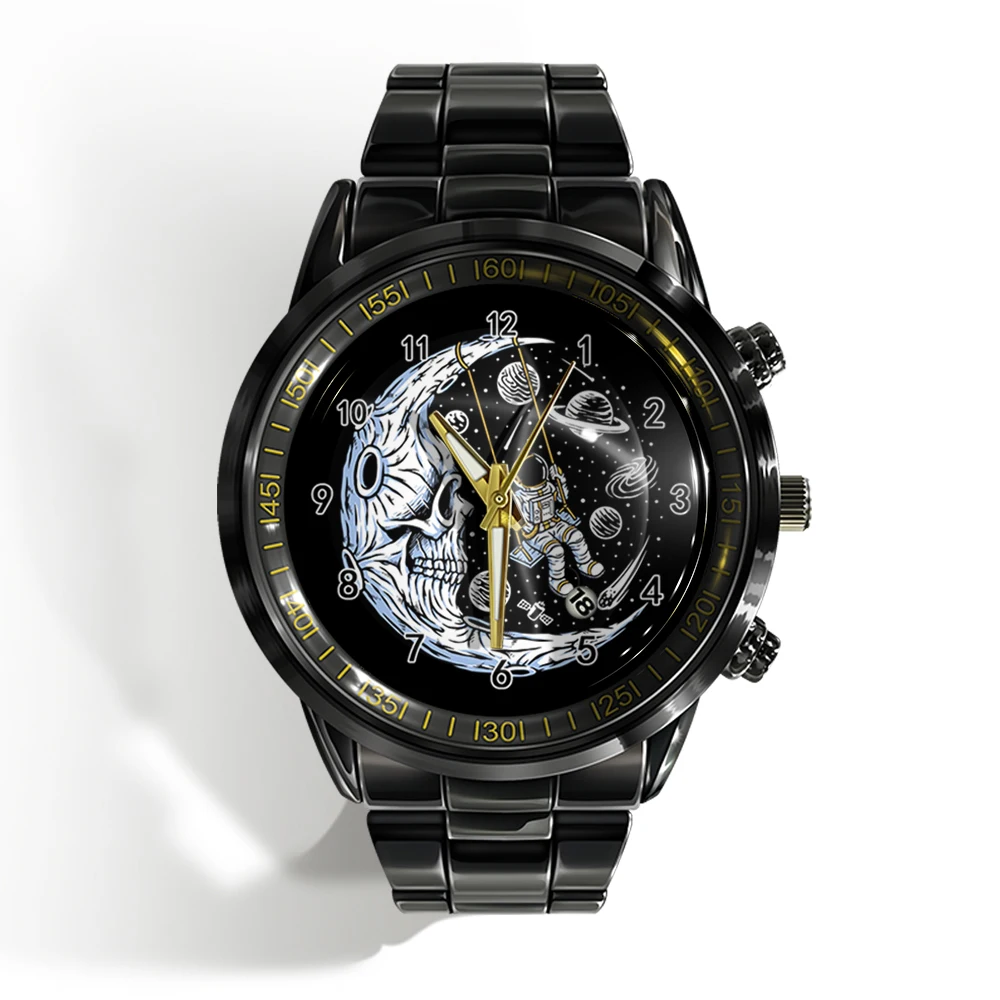 « Skull Watch »: Montre-bracelet de luxe pour homme avec calendrier, crâne d’horreur et plat noir et blanc.