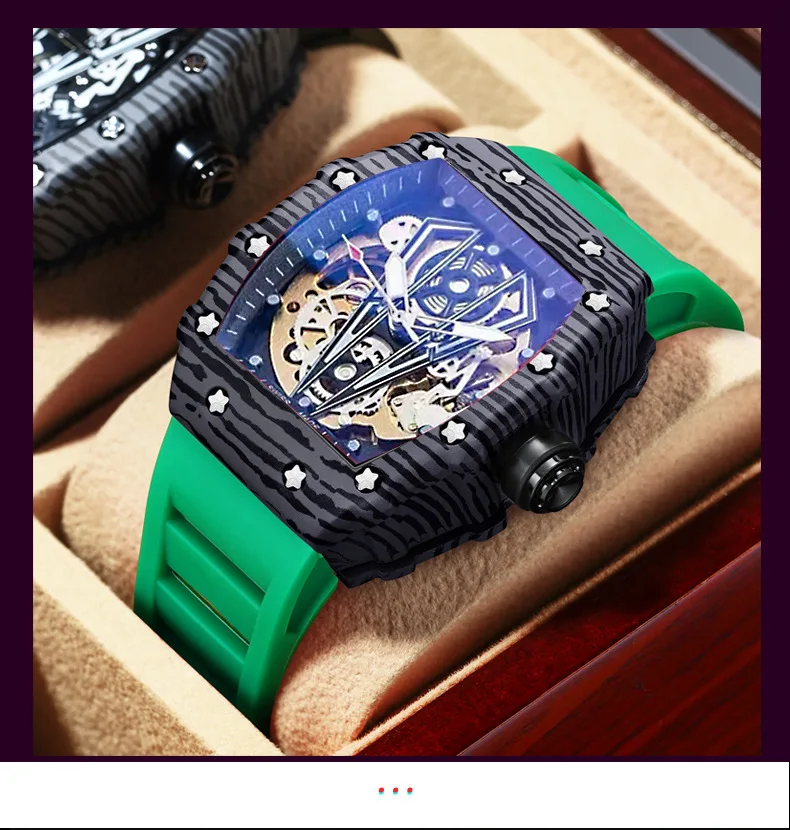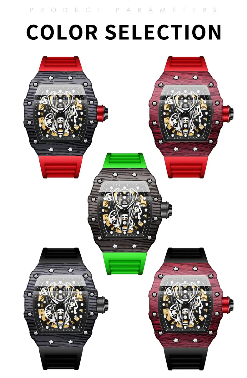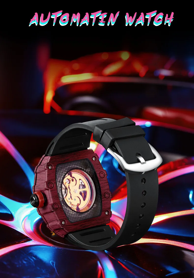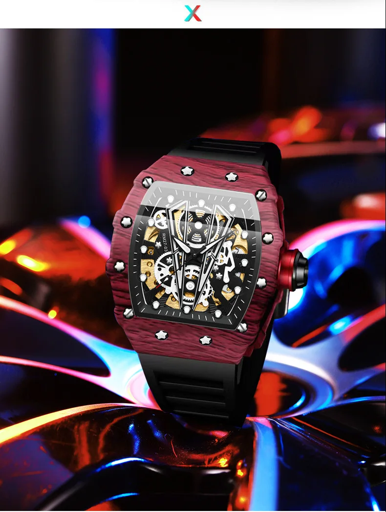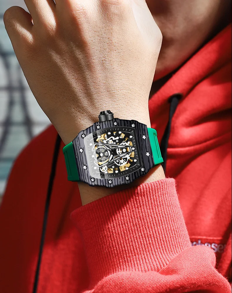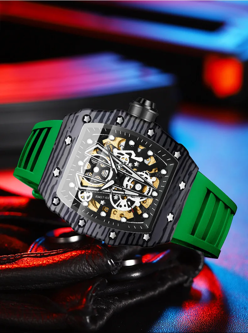 Montre mécanique automatique pour hommes Tonneau Hollows Luxury Women Watch 3bar Waterproof Hardlex Silicone Watch Band Relogios Masculino