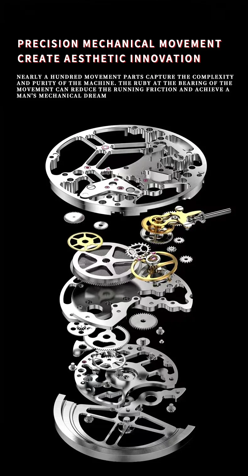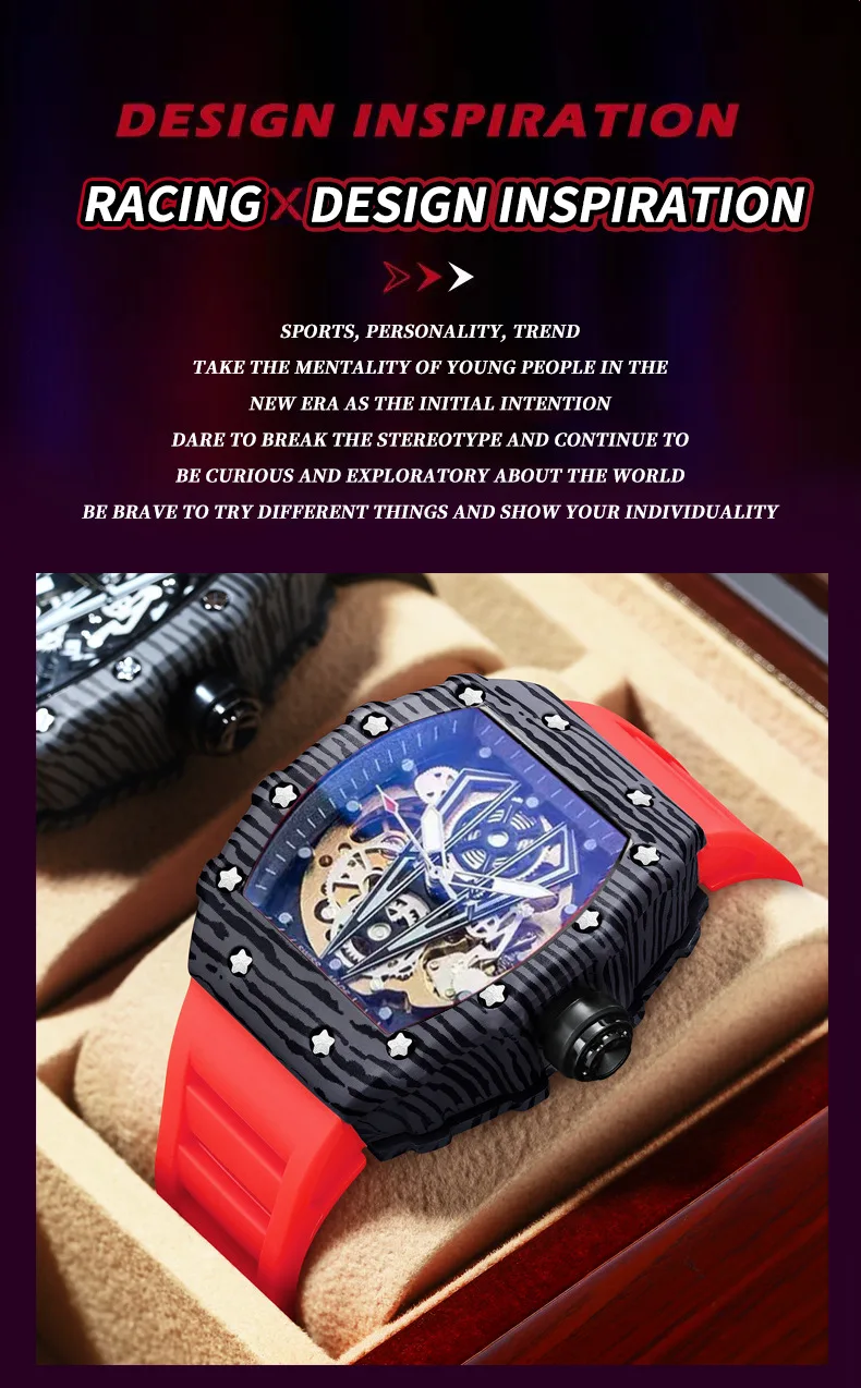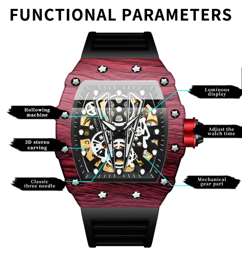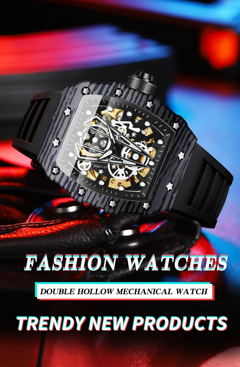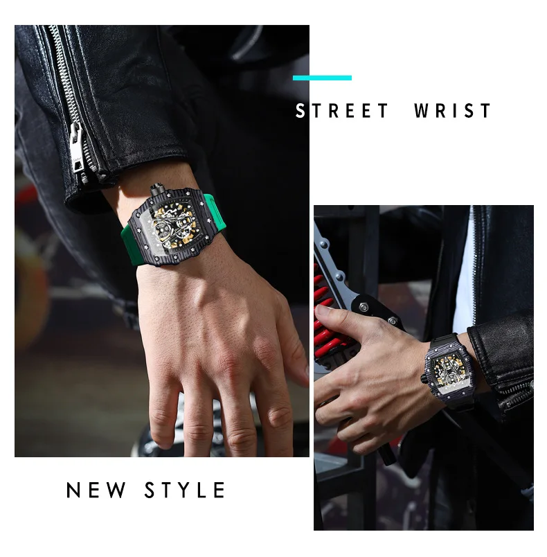Montre mécanique automatique pour hommes Tonneau Hollows Luxury Women Watch 3bar Waterproof Hardlex Silicone Watch Band Relogios Masculino