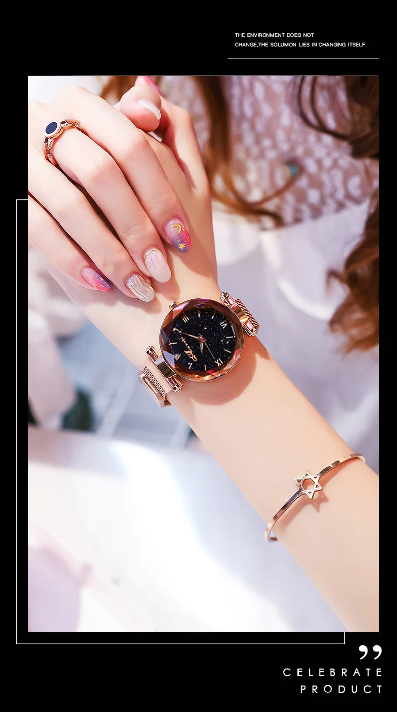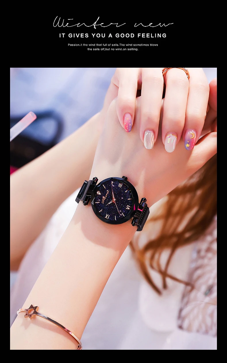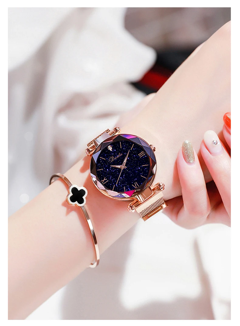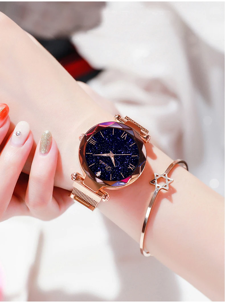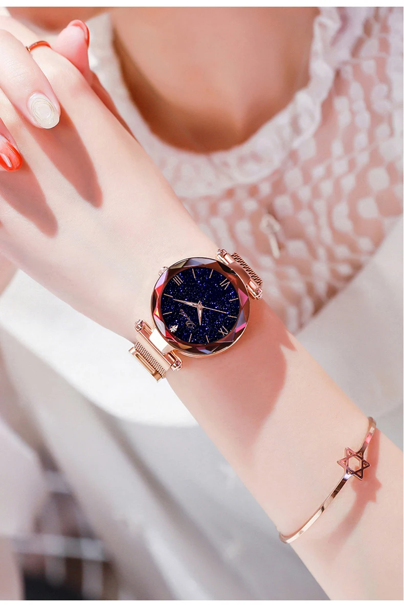 Nouvelle montre à la mode pour femmes, montre-bracelet élégante à Quartz magnétique pour femmes, boucle ciel étoilé, chiffres romains, cadeau, livraison directe