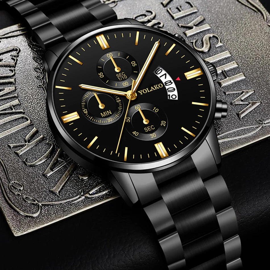« Cadran d’or » – Montre-bracelet luxueuse en acier inoxydable pour hommes, à Quartz, avec calendrier et style original.