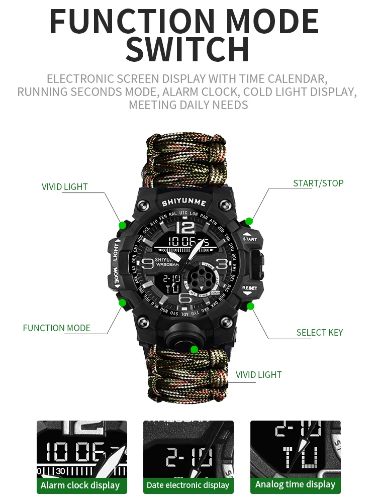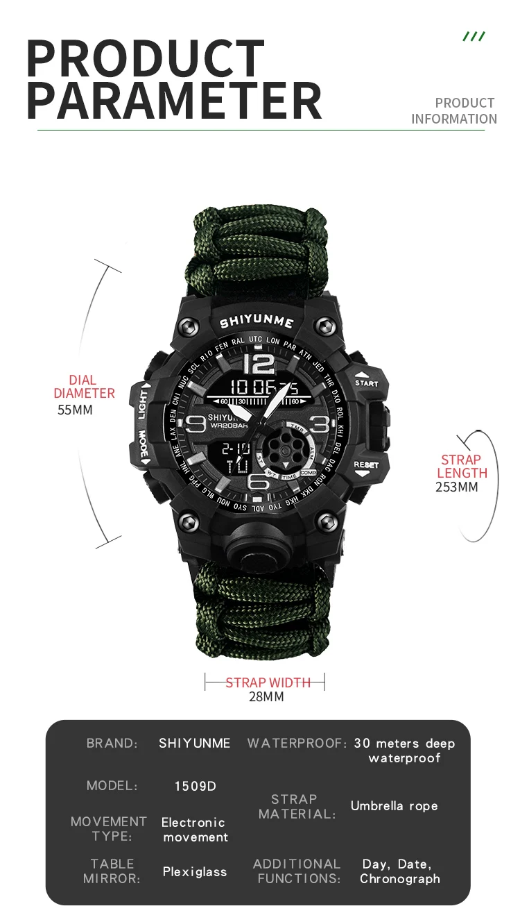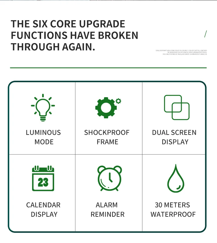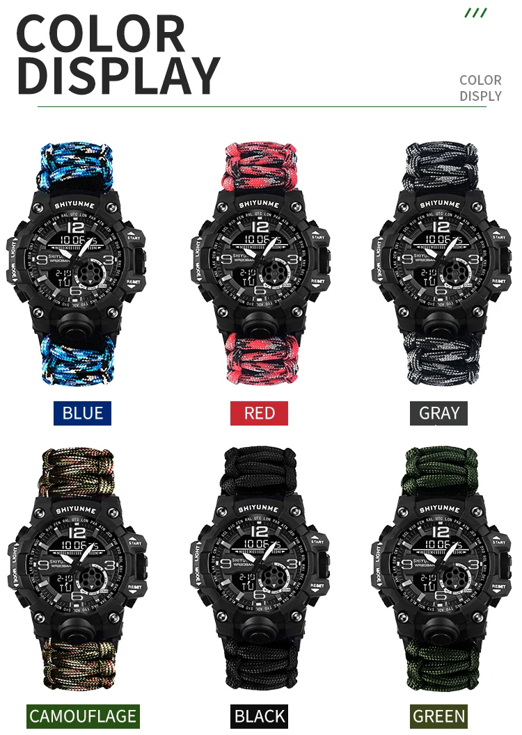 • Caractéristique: chronomètre,lumière arrière,Résistant aux chocs,Affichage LED,Répéteur,RATTRAPANTE,Luminous,Date d’auto,Chronographe,Calendrier complet,PLONGEUR,Fuseau horaire multiple,calendrier perpétuel,Résistant à l'eau,ALARME,COMPASS,Nager,Affichage de la semaine,mesure de la température
