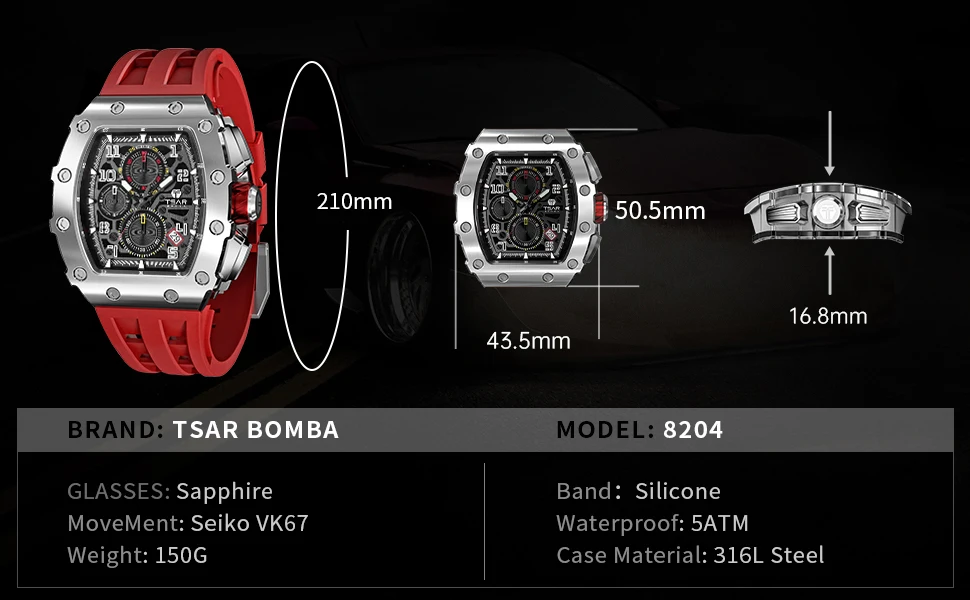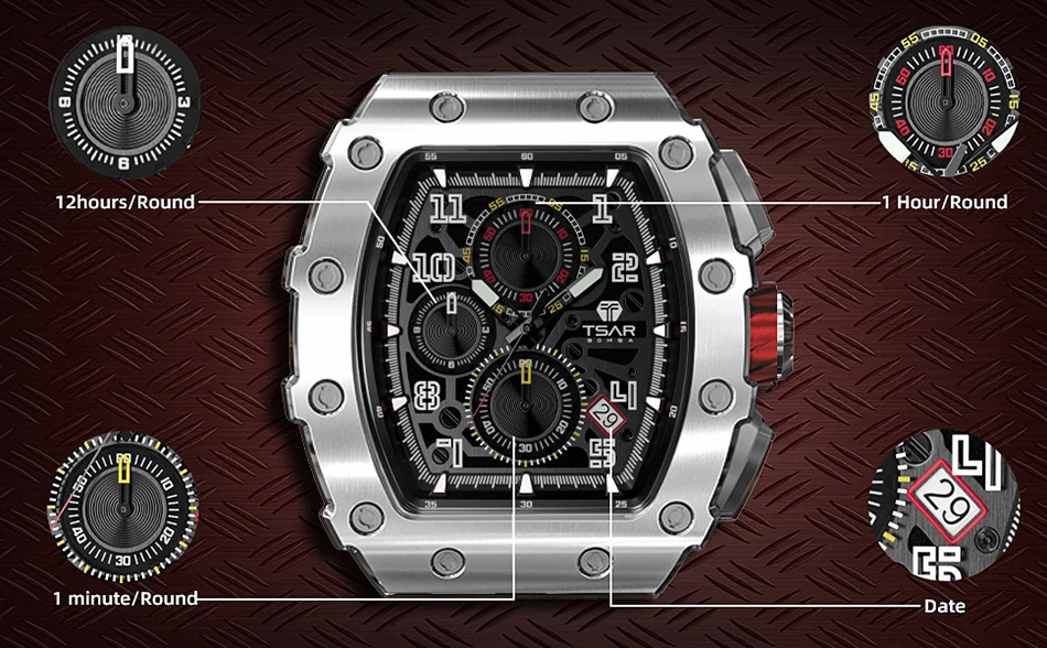 Son design masculin d’inspiration mécanique avec son boîtier surdimensionné et ses détails audacieux offre une ambiance décontractée et robuste qui est parfaite pour toute aventure, de jour comme de nuit. Que vous cherchiez une montre quotidienne, quelque chose pour une occasion spéciale ou un cadeau pour vos proches, vous la trouverez ici. La montre TSAR BOMBA est toujours le choix parfait comme cadeau pour vous, que ce soit à la fête d’anniversaire, à noël, à la fête des pères, à la saint-valentin etc, ou un cadeau qui mérite soi-même.